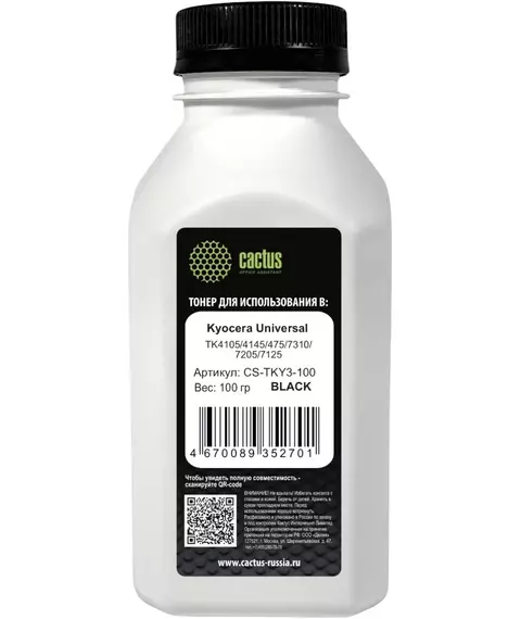 Тонер Cactus CS-TKY3-100 черный флакон 100гр. для принтера Universal TK4105/4145/475/7310/7205/7125, FS-1300/1030/1350/1028/1128/1100/1120/ 1320/1370/2000/3900/3920/3040/3140/ 3540/3640/4000/2020/4020/9030/9130/ 9530/6025/6525/6525/6530/KM 3050/4050/5050/1620/2550/2540/ECOSYS P2035/P2135d/P223 [CS-TKY3-100]