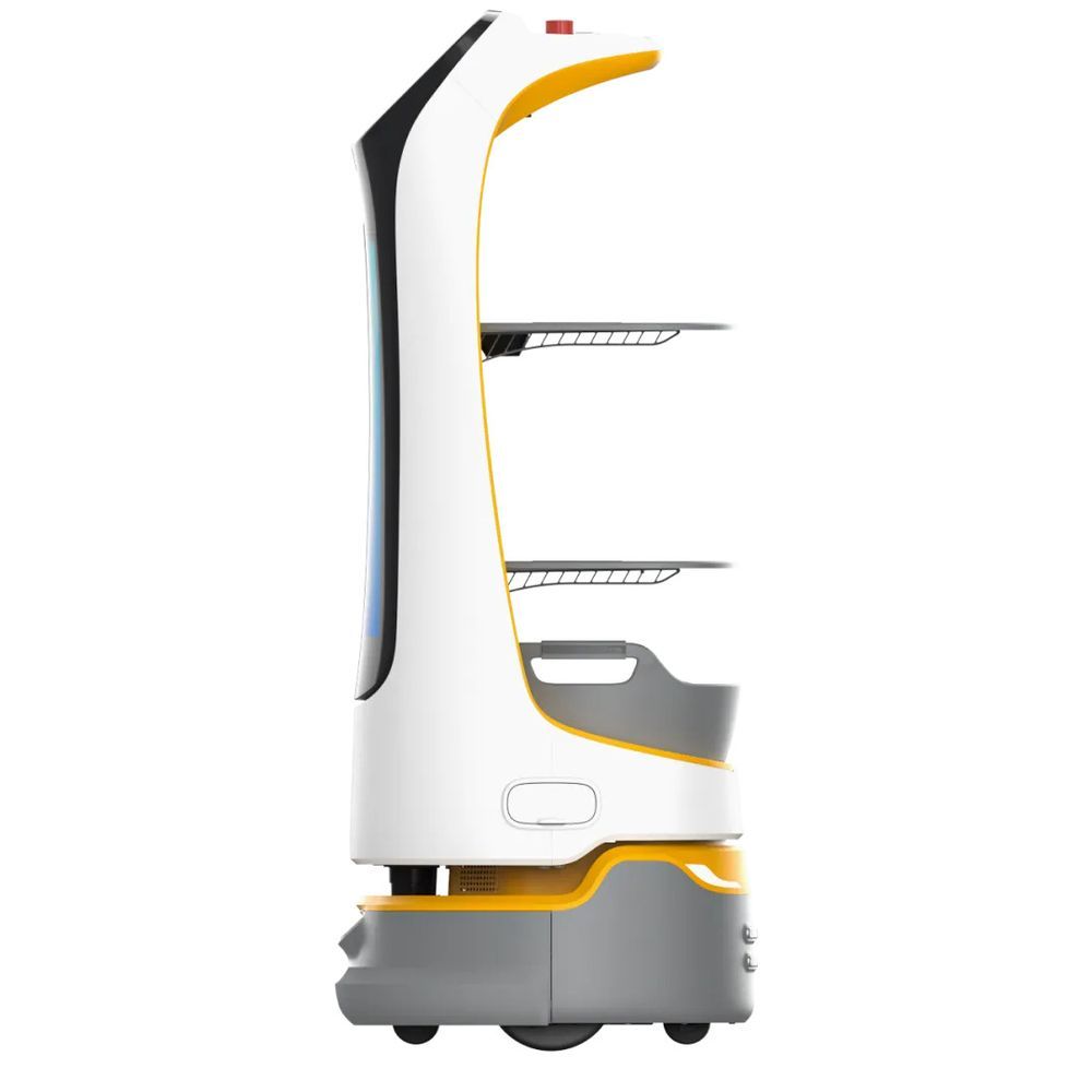 | Особенности | Для использования внутри помещений. Режимы: привлечение клиентов, сопровождение, «круиз», доставка и «день рождения». Распознавание лиц. Широкоугольная камера типа "рыбий глаз". Съемные лотки (полки): 352x340мм. Расстояние между лотками (сверху вниз): 248/253/223мм. Датчики лотков. Минимальный коридор для проезда: 55см (низ)/52см (верх). Предупреждение о низком уровне заряда аккумулятора и автоматическая подзарядка. |
