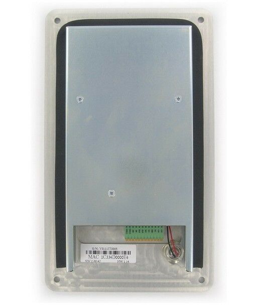 Размеры: панель домофона – 13,8 х 23,3 см; рамка для встраивания в стену – 9,8 х 19 х 2,5 см