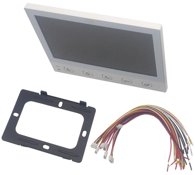 - Монитор видеодомофона с кабелем питания 220В, крепежный комплект, кронштейн для установки, соединительный кабель (4 контакта), паспорт, тарная упаковка