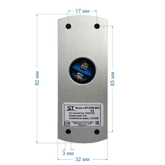 Кнопка выхода ST ST-EXB-M04 (версия 2) 3А/36В, Типы контактов: NO/COM, Тип монтажа: Накладной, Механическая, –35..+55°C, IP65, Цинковый сплав, Серебряный, 80*30*25 мм