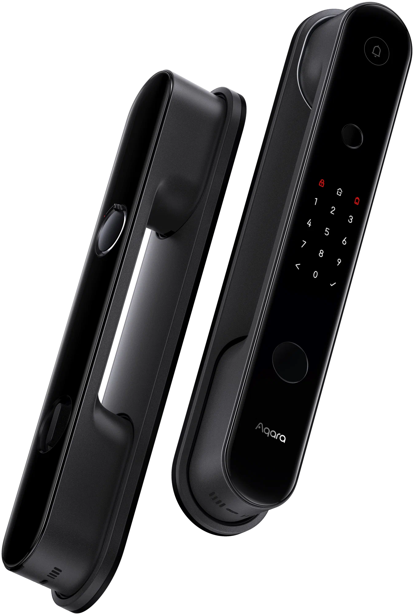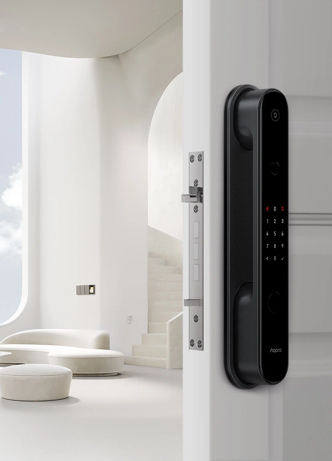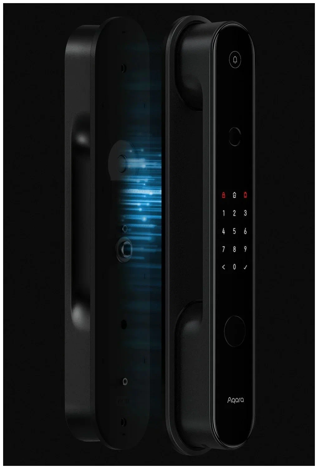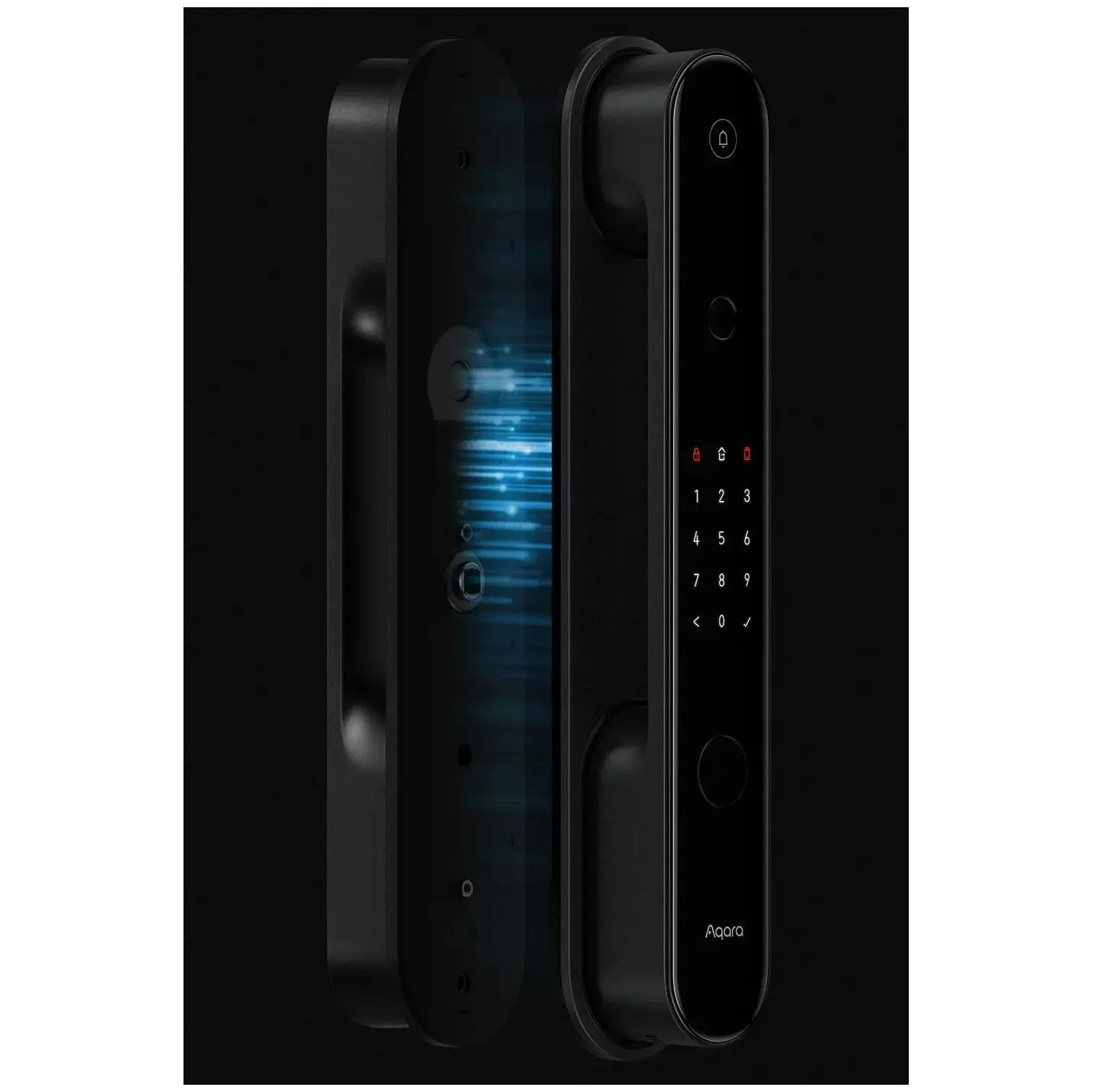 Корпус замка изготовлен из стекла и металла. Встроенный сканер отпечатков пальцев расположен так, что ваш большой палец будет естественно касаться его при открытии двери. Помимо этого, дверной замок оснащен функциями: проверка состояния замка, напоминания о низком заряде батареи.