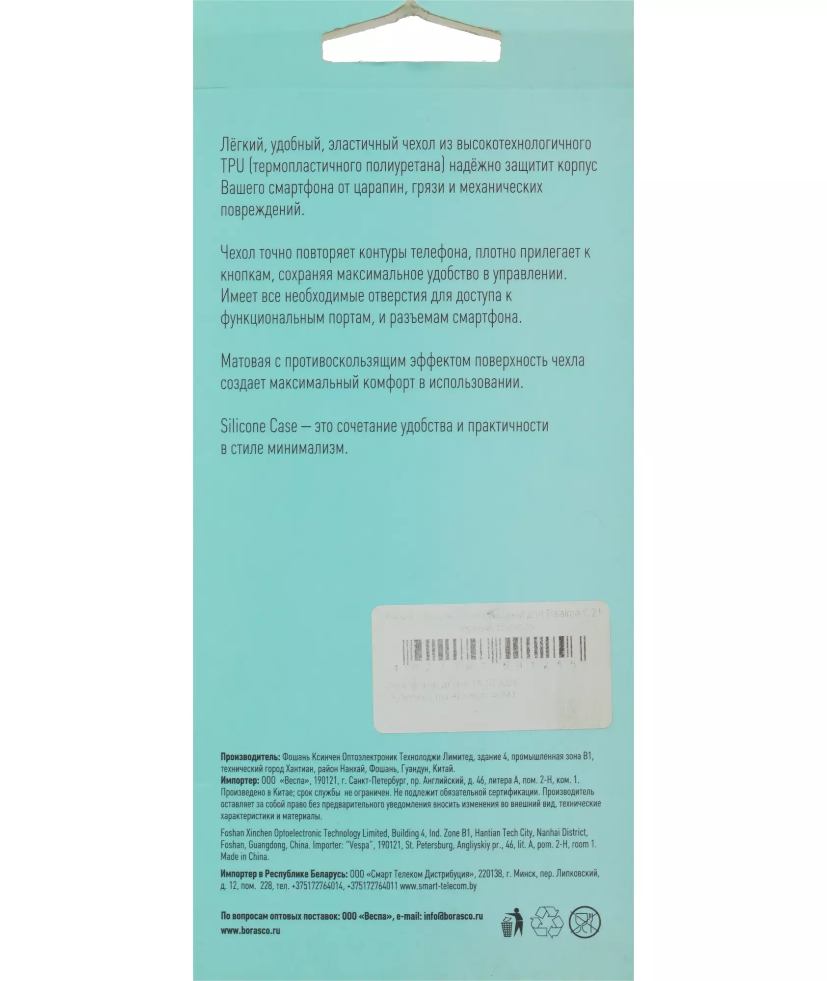 Силиконовый чехол BoraSco специально разработан для смартфонов Realme C21. Благодаря толщине материала не более 0,8мм чехол минимально увеличивает размеры смартфона, при этом защищает заднюю панель от царапин, грязи и пыли, а матовая поверхность предотвращает выскальзывание из рук.