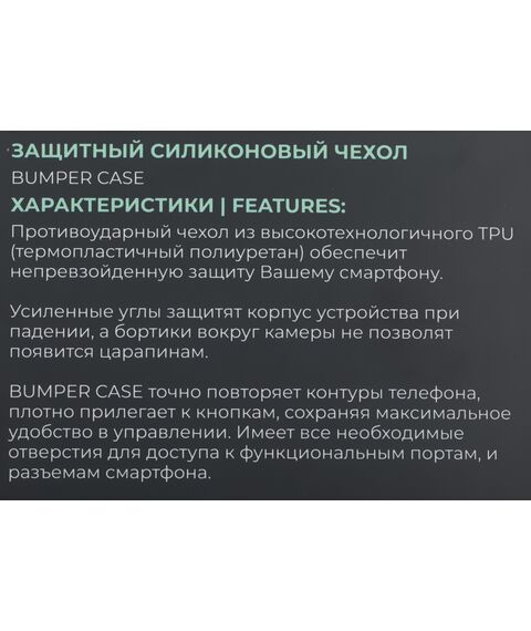 Прозрачный противоударный силиконовый чехол Bumper Case c усиленными углами и защитным бортом надёжно защитит корпус Вашего устройства от царапин, грязи и механических повреждений. Имеет все необходимые отверстия для доступа к функциональным портам и разъемам.