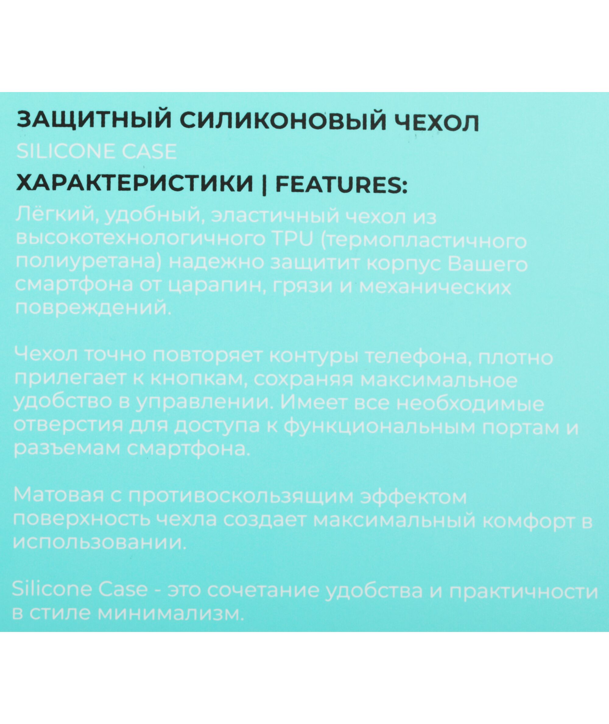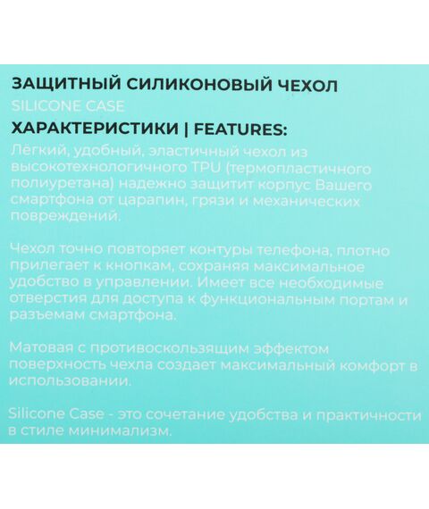 Чехол Silicone Case специально разработан с учётом всех особенностей Вашего смартфона. Благодаря толщине материала не более 0,8мм чехол минимально увеличивает размеры смартфона, при этом защищает заднюю панель от царапин, грязи и пыли, а матовая поверхность предотвращает выскальзывание из рук.