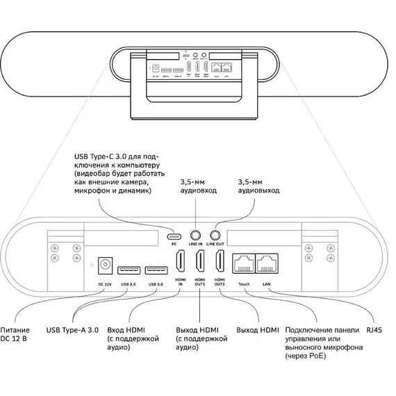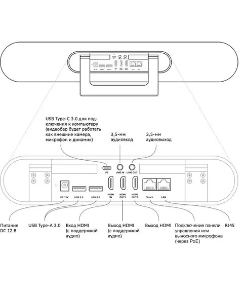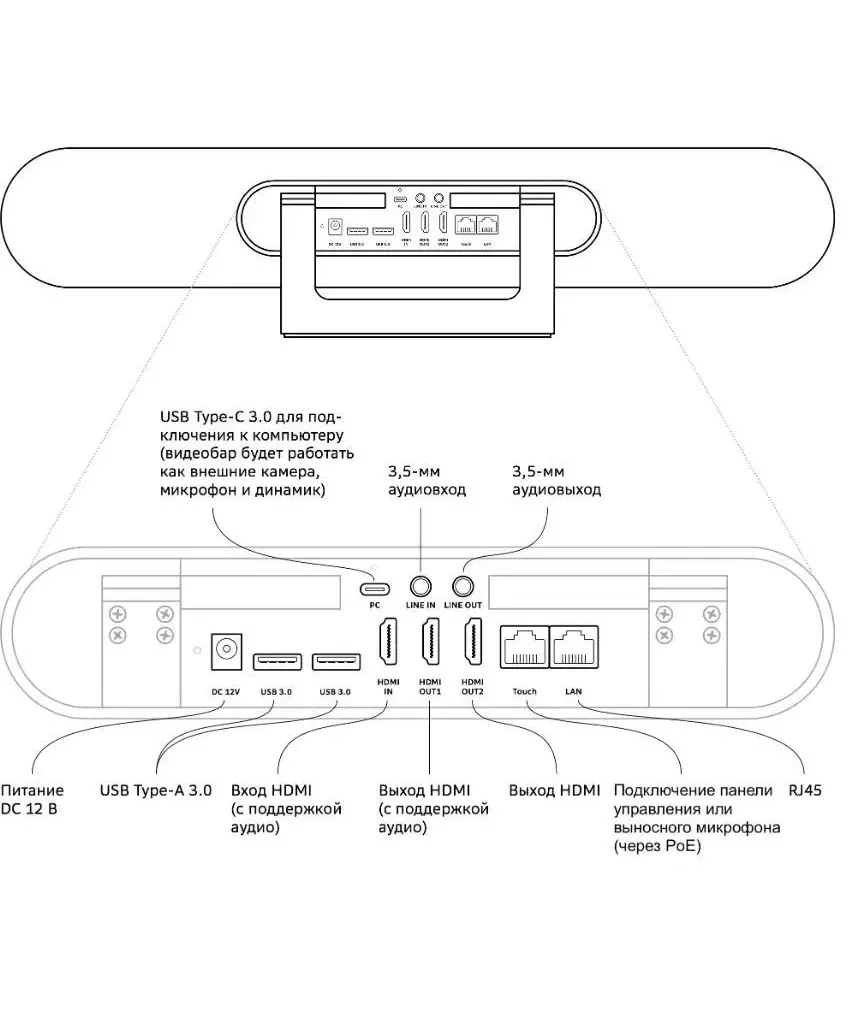 | Особенности / доп.информация | Видеобар Sber SDVB-4x001B служит для конференц-связи, трансляции изображения и звука из переговорной комнаты. Он оснащён массивом из четырёх высокочувствительных микрофонов и широкоугольной ePTZ-видеокамерой с функцией автоматического кадрирования и наведения на говорящего. |
