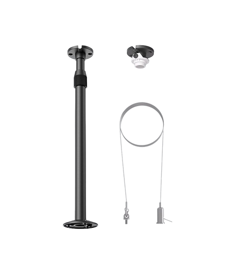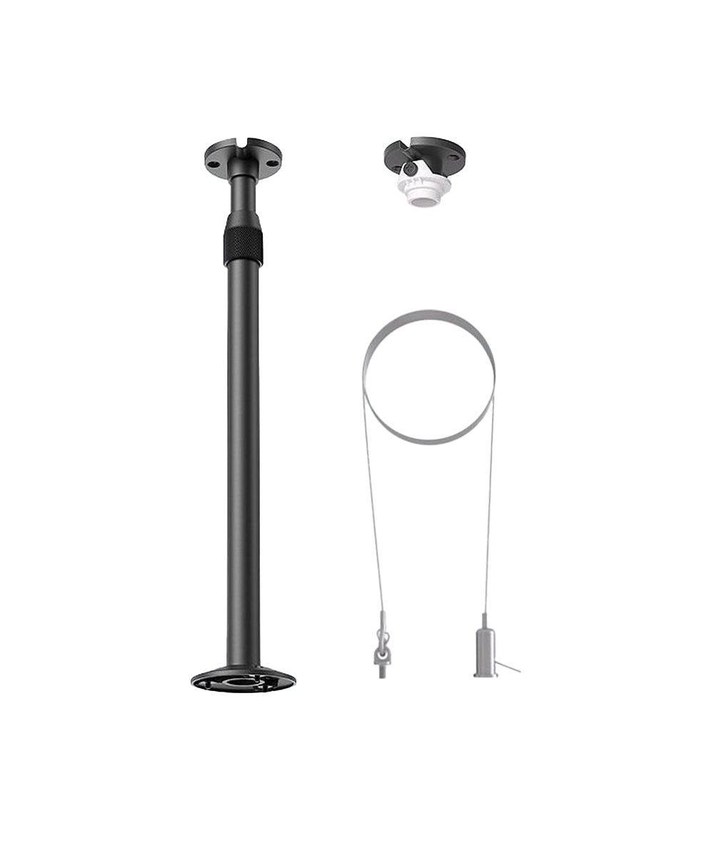 Потолочное крепление обеспечивает превосходный захват голоса благодаря оптимальному расположению микрофона. Телескопическая штанга позволяет легко регулировать высоту и точно позиционировать микрофон в помещениях любого размера. Для временной установки предусмотрены подвесные тросы, что делает комплект универсальным решением для различных условий.
