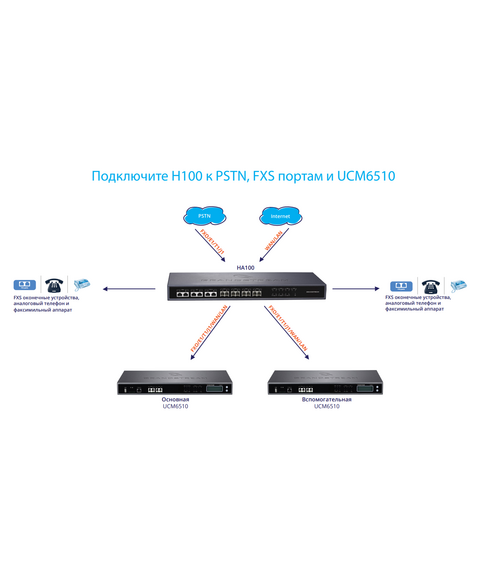 Модель HA100 – это решение автоматического перехода на резервную схему в случае отказа для IP АТС UCM6510. При подключении к двум UCM6510, HA100 постоянно отслеживает рабочее состояние обеих UCM6510 и автоматически переключает управление системой (включая все подключенные телефонные линии, сетевые подключения, дополнительные устройства и все SIP-оконечные устройства, которые были зарегестрированны на основной UCM6510) на резервную вспомогательную UCM6510 в случае отказа основной UCM6510.