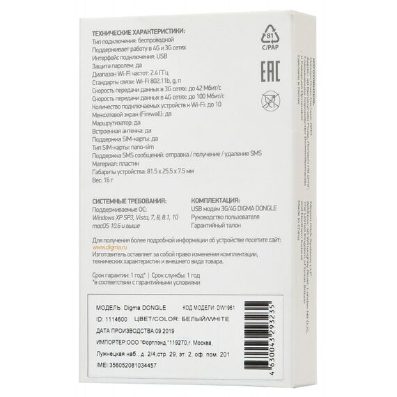 USB модем 3G/4G Digma Dongle DW1961 с интегрированным Wi-Fi роутером – универсальный инструмент для подключения к Интернету по сети сотовой связи ПК, ноутбуков, планшетов, онлайн-камер и иных устройств. Модем может получать питание как непосредственно через USB-порт гаджета, так и от пауэрбанка или сетевого адаптера.