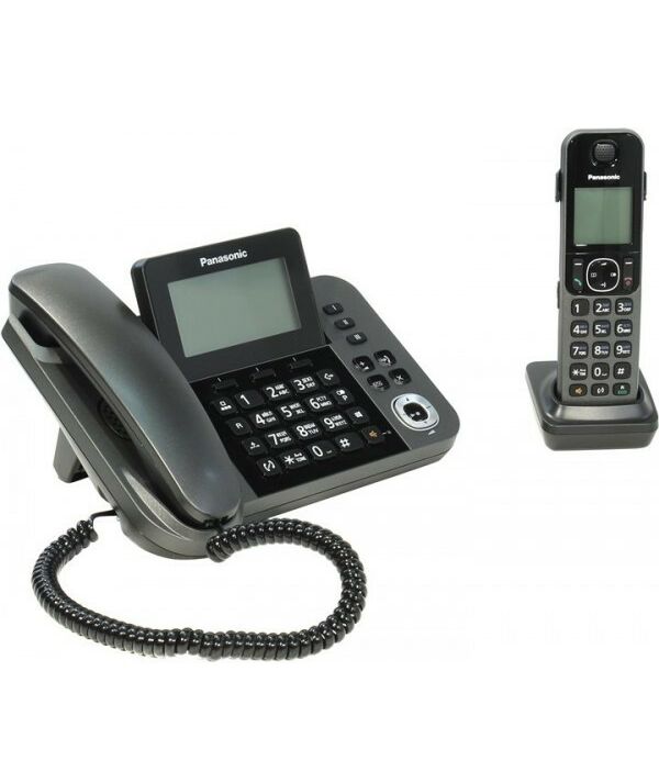 Проводной телефон+р/телефон Panasonic KX-TGF320RUM черный металлик, трубка с ЖК дисплеем, DECT, А/Отв