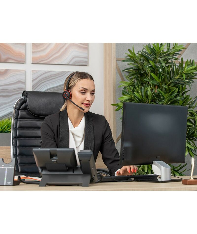 - VT9400 - беспроводная моноауральная DECT-гарнитура с HD-звуком. Базовая станция DECT совмещена с зарядным устройством. Данную гарнитурулегко можно подключить к любому телефону через аналоговый разъём RJ9 (в комплекте кабель типа 3 для подключения к телефонам Yealink, Grandstream, Snom; для подклчюения к другим телефонам необходимо приобрести соответствующий кабель-переходник) и к ПК/Ноутбуку или телефонному аппарату через USB (type-A).