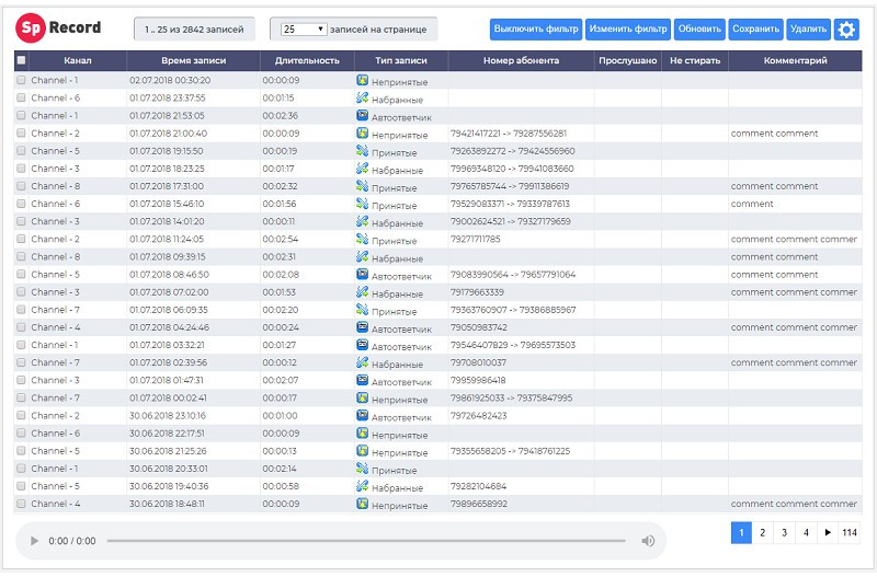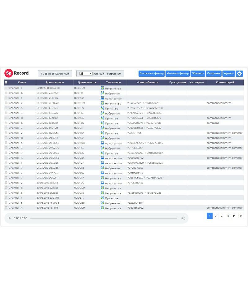 - клиент-серверный режим: бесплатное специализированное ПО SpRecord для windows, сбор данных в единую базу с нескольких устройств, в том числе удалённых объектов, возможность гибкого поиска записей по всем каналам и разграничением прав доступа;