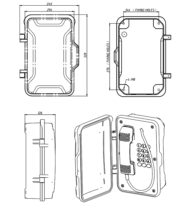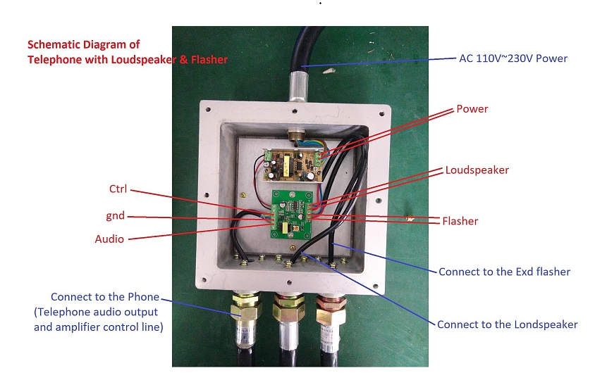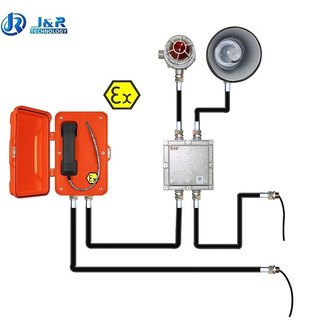 - Всепогодный взрывозащищенный промышленный SIP-телефон в комплекте с взрывозащищенными горном и проблесковым маяком. Изготовлен из литого под давлением алюминия с антикоррозионным эпоксидным порошковым покрытием и имеет степень защиты от окружающей среды IP67. Рекомендован для использования в метро, горнодобывающей промышленности, тоннелях, заводах, электростанциях, железных дорогах и т. д.