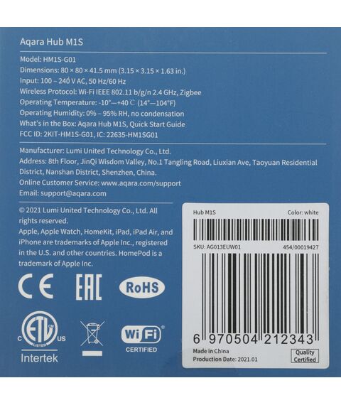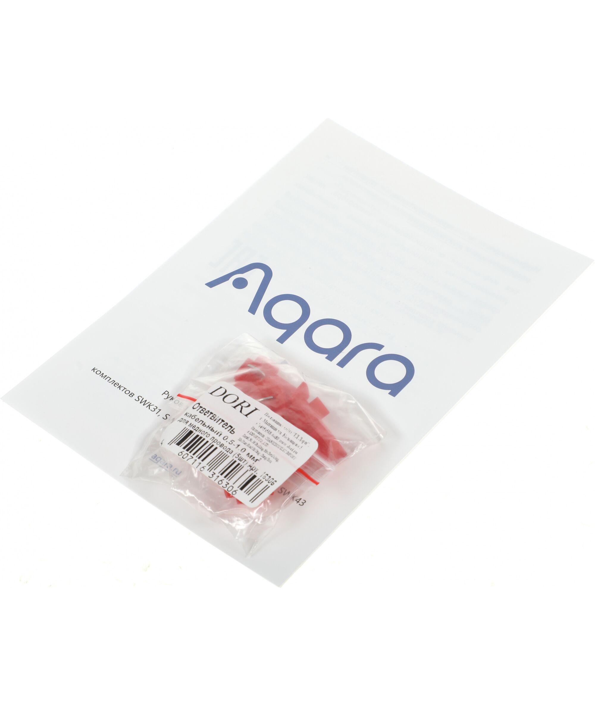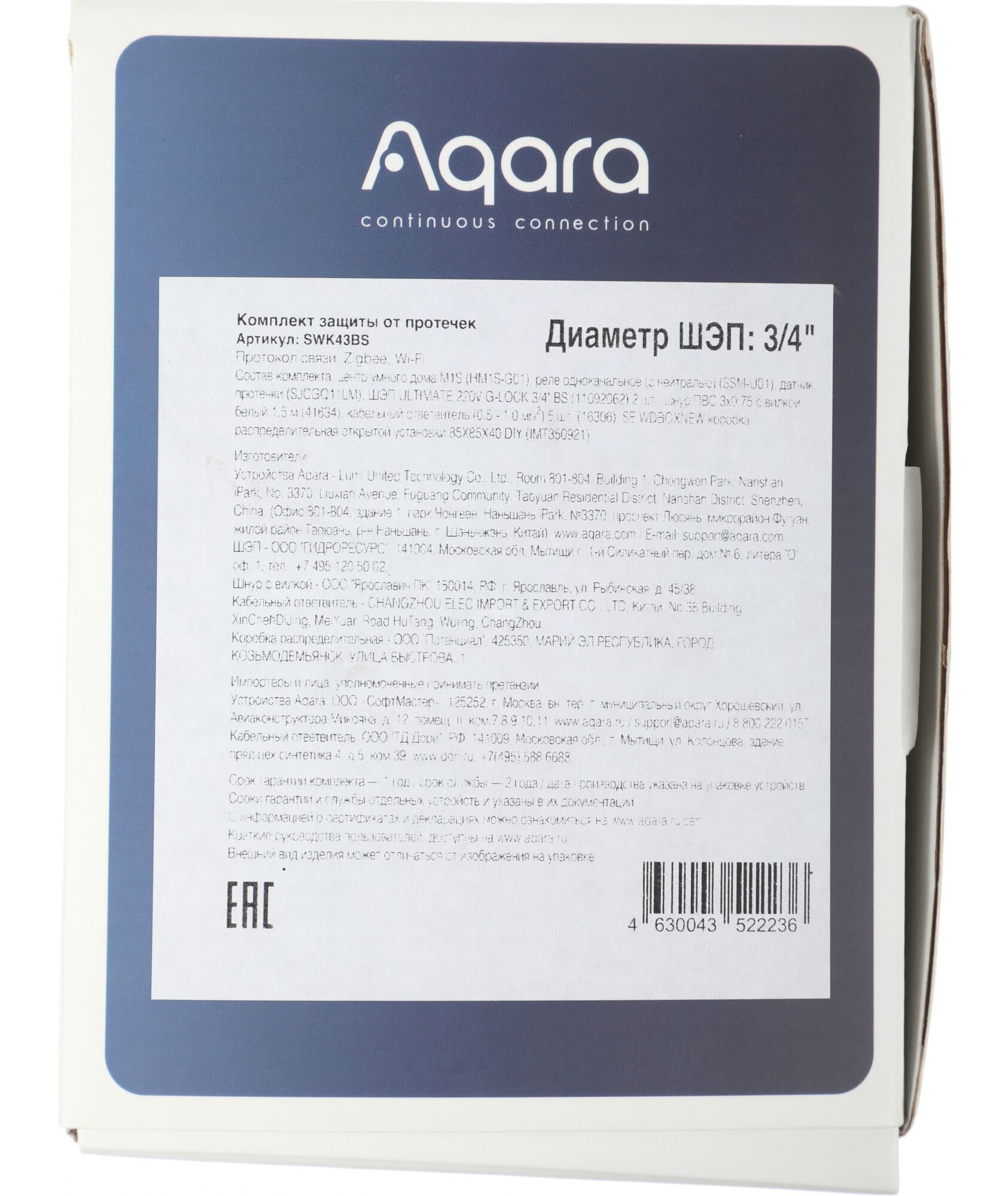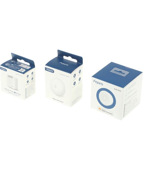 Aqara SWK43 — набор для подключения системы Умного дома, состоящий из центра умного дома, датчика, фиксирующего протечки, и элементов, необходимых для установки. При срабатывании устройство отключает подачу воды и отправляет уведомление на телефон пользователя.