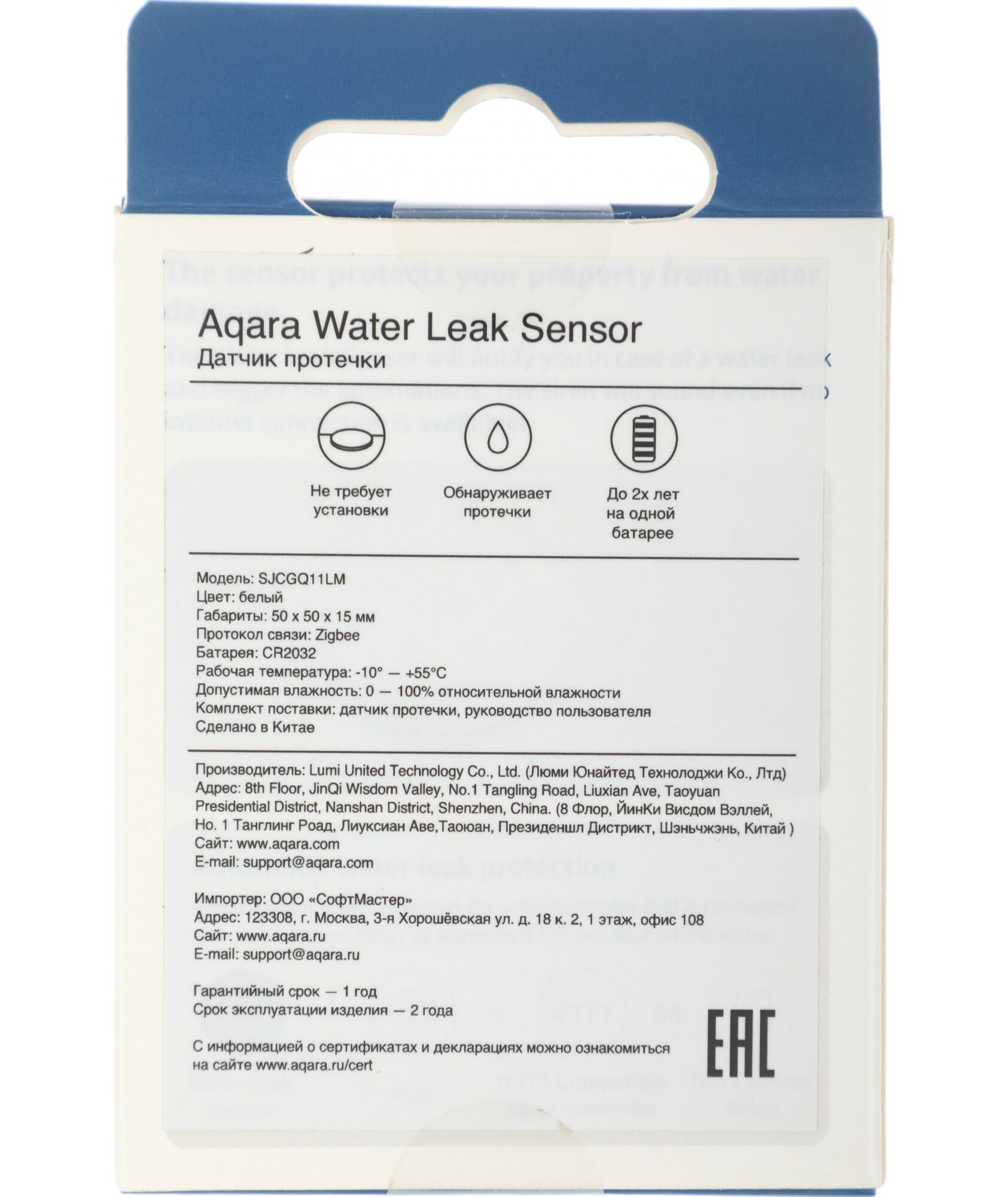 | Тип элементов питания (датчик протечки воды) | CR2032 |