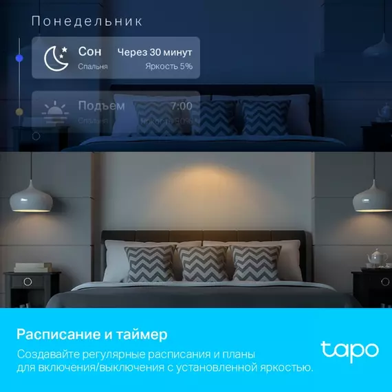 | Возможности | Группирование устройств — изменяйте настройки сразу для множества светильников одним нажатием через приложение.Энергосбережение — пониженное энергопотребление без потери яркости.Удалённое управление — позволит мгновенно включать и гасить свет через приложение Tapo. |