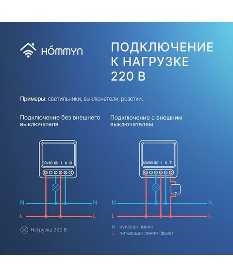 Для подключения к электрической цепи необходимы нулевая линия (N) и питающая линия (L). Также для работы приложения Hommyn потребуется Zigbee хаб — Блок управления (шлюз) HOMMYN Hub HH-01.