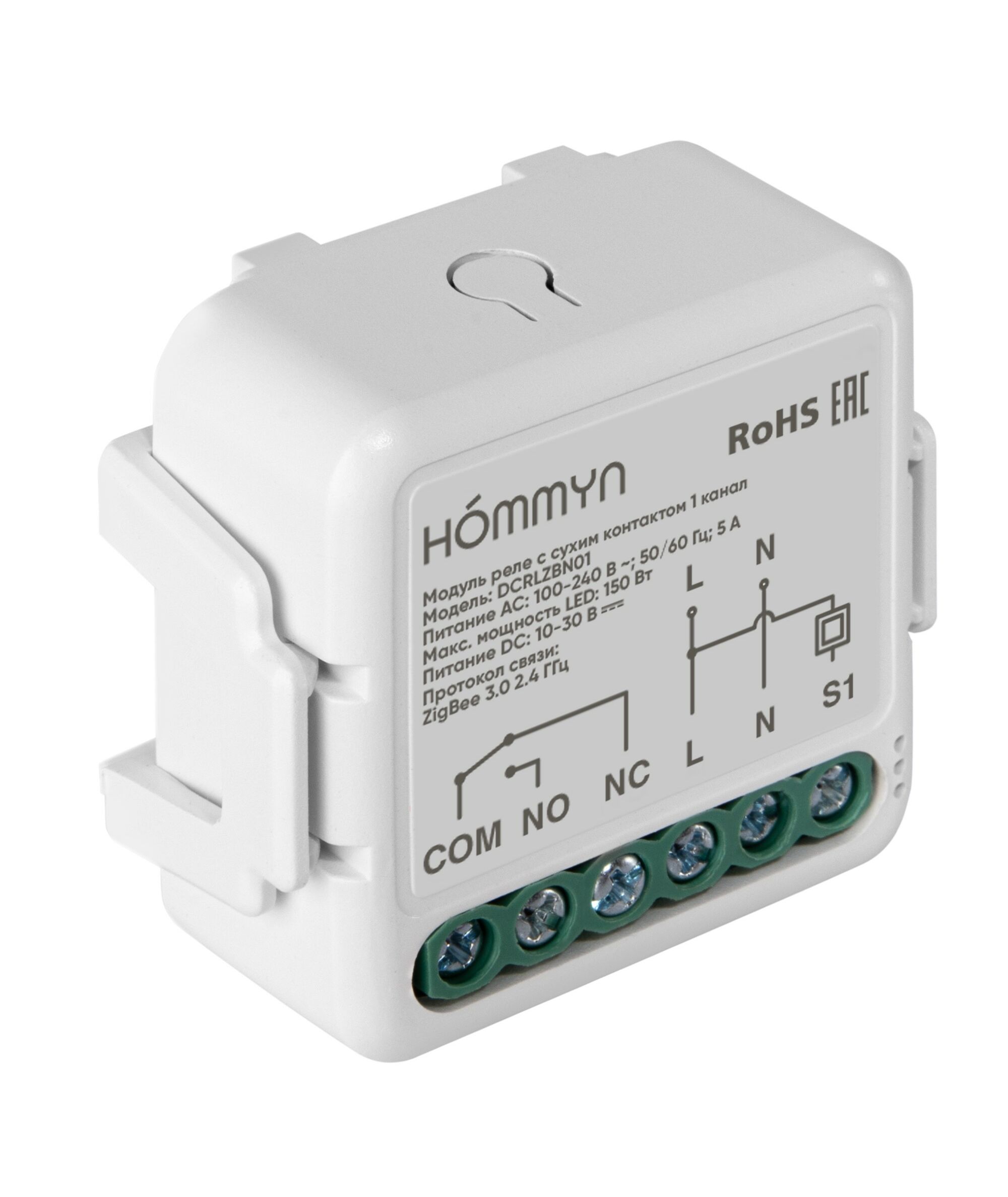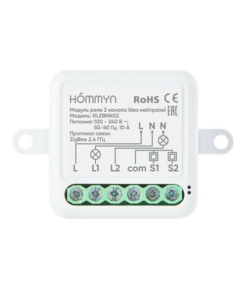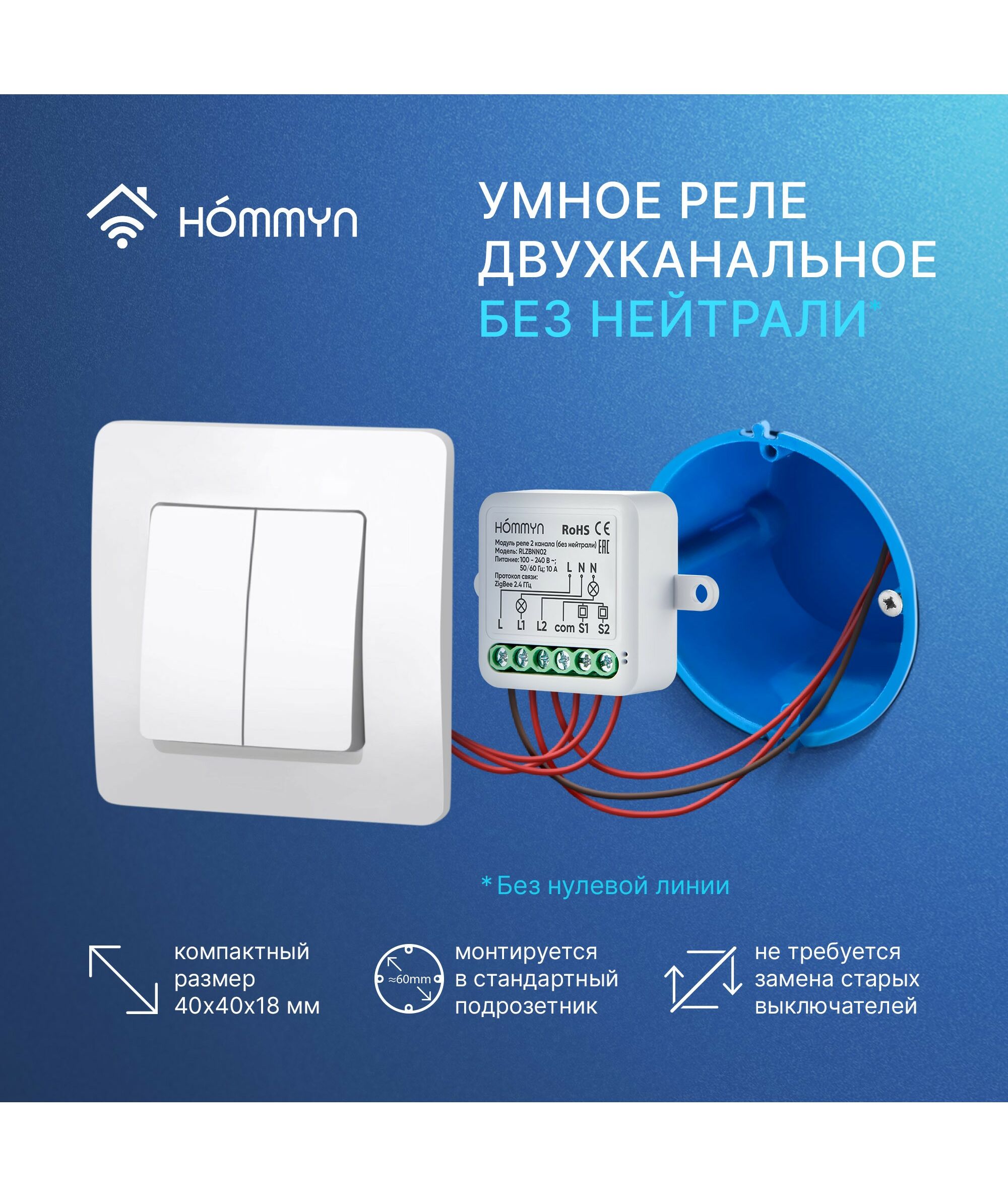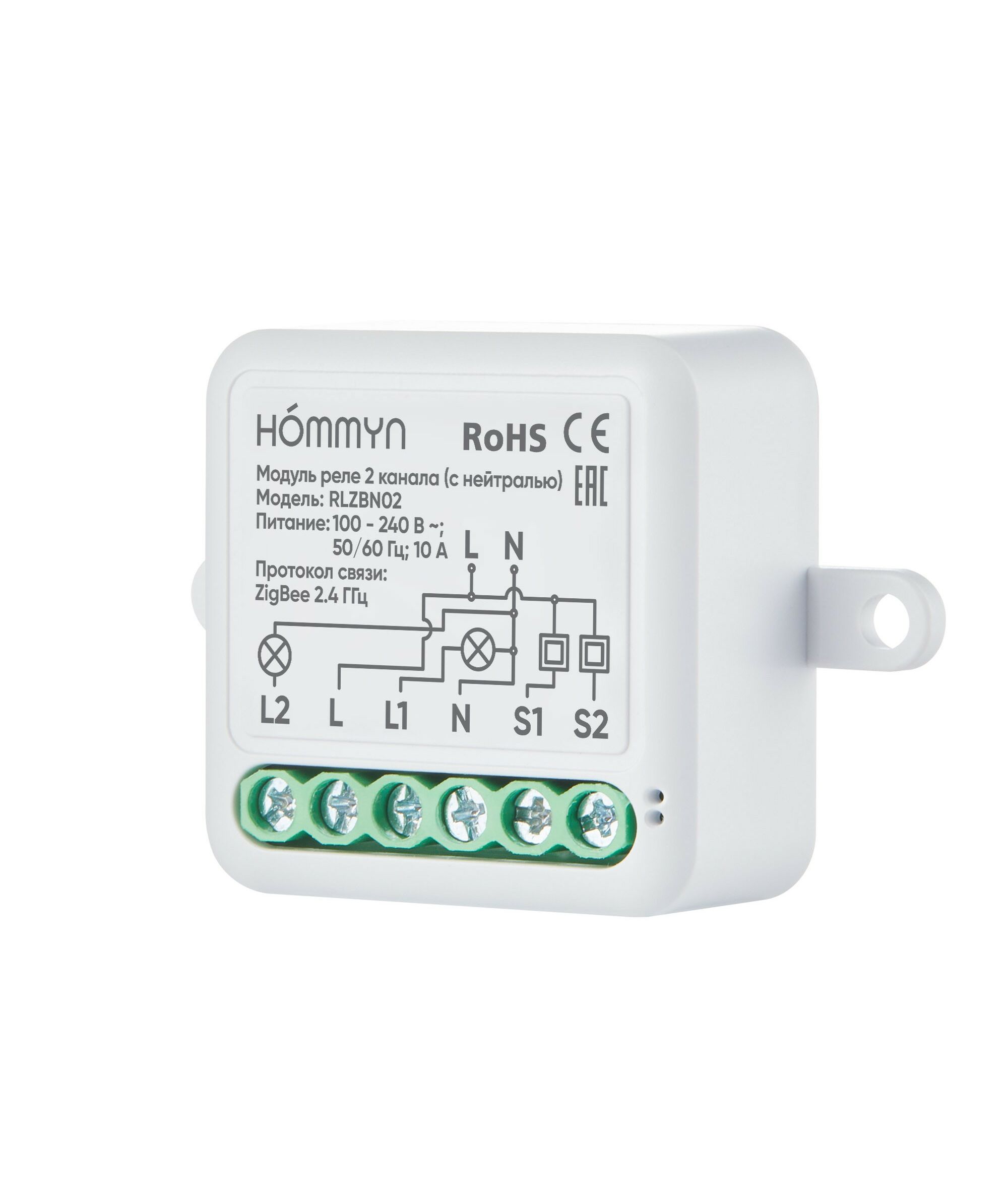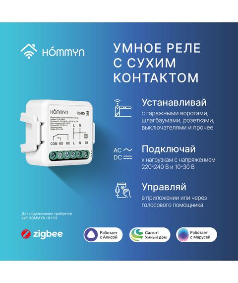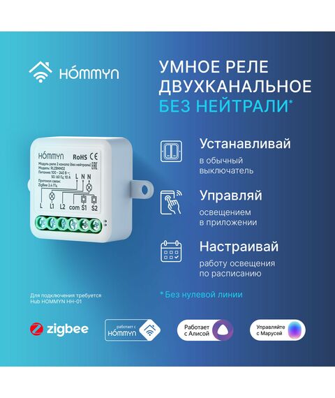 Чтобы подключить реле, необходимы питающая линия L (фаза) и нулевая линия N (нейтраль). Умное реле не только управляет включением и выключением освещения или устройств через стандартный выключатель, но и предоставляет возможность удаленного управления через приложение или с помощью голосовых помощников Алиса и Маруся. Реле совместимо с приложением Hommyn и требует для подключения Zigbee хаб Hommyn. Оно также работает с голосовыми станциями Алиса от Яндекс с Zigbee и интегрируется в приложение Умный Дом.