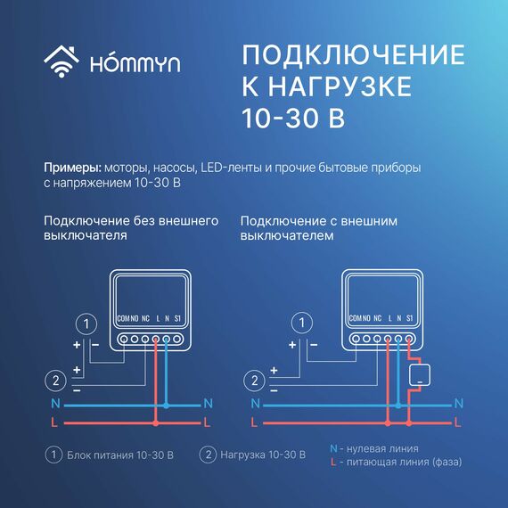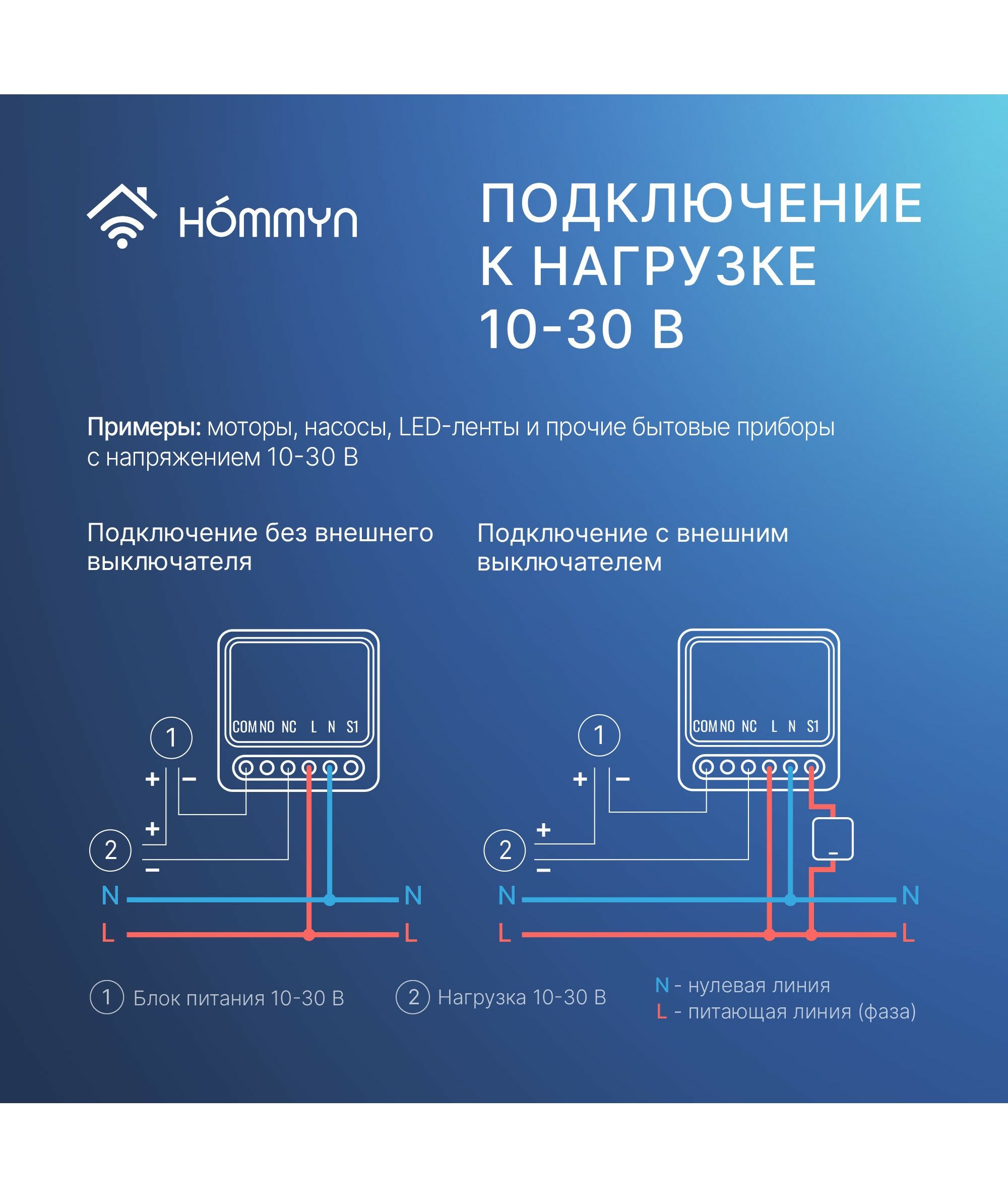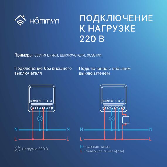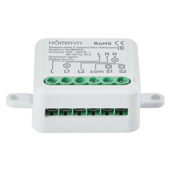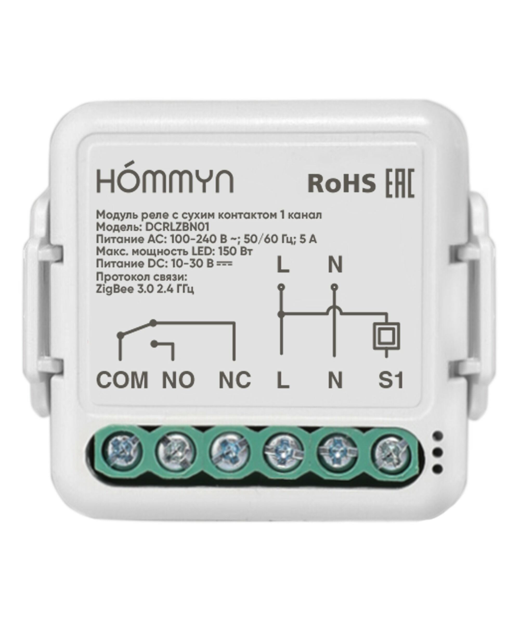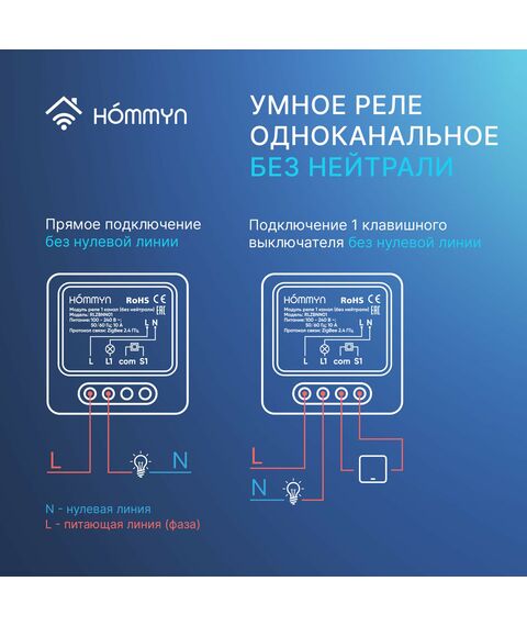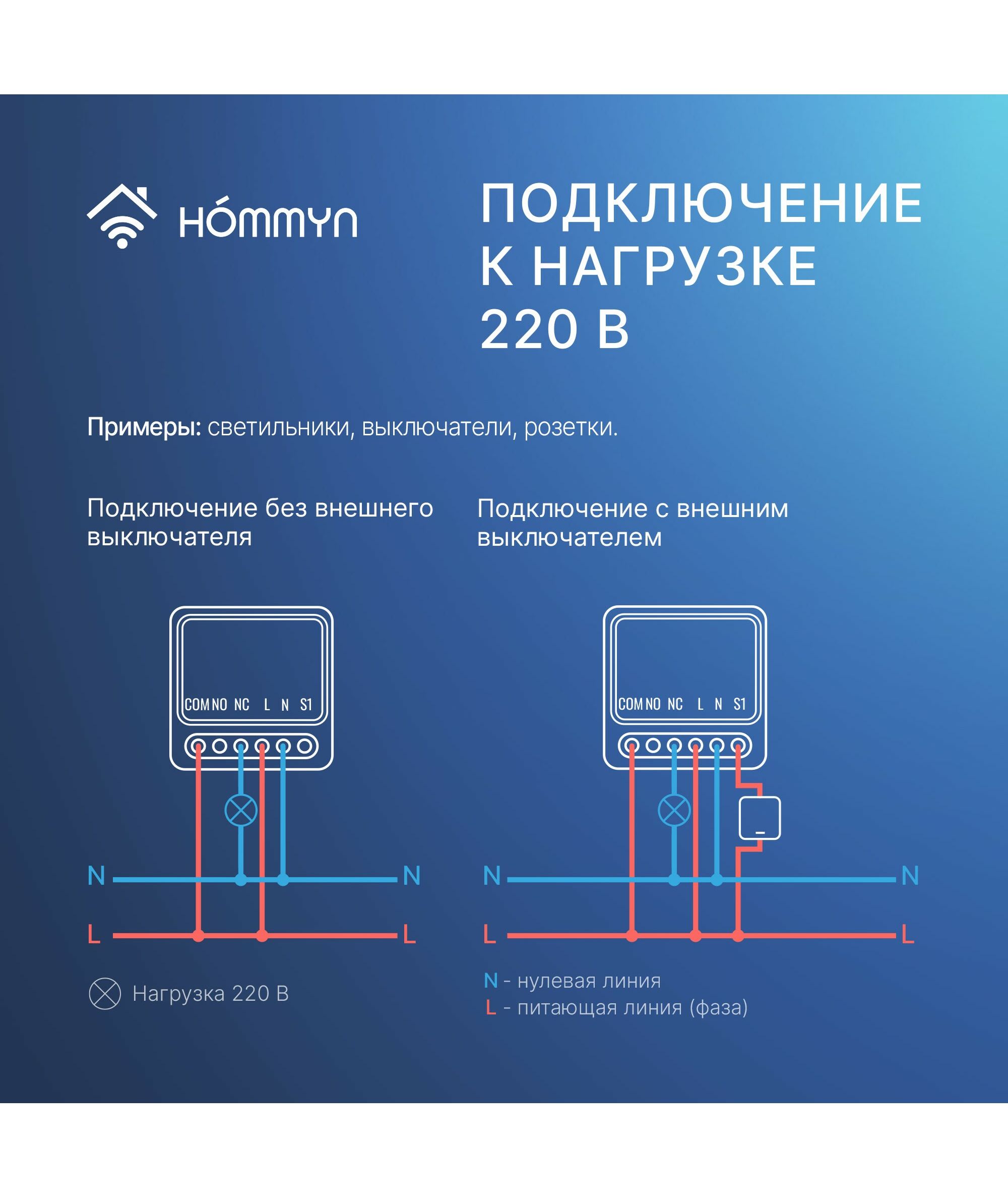 Чтобы подключить реле, необходимы питающая линия L (фаза) и нулевая линия N (нейтраль). Умное реле не только управляет включением и выключением освещения или устройств через стандартный выключатель, но и предоставляет возможность удаленного управления через приложение или с помощью голосовых помощников Алиса и Маруся. Реле совместимо с приложением Hommyn и требует для подключения Zigbee хаб Hommyn. Оно также работает с голосовыми станциями Алиса от Яндекс с Zigbee и интегрируется в приложение Умный Дом.
