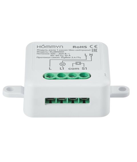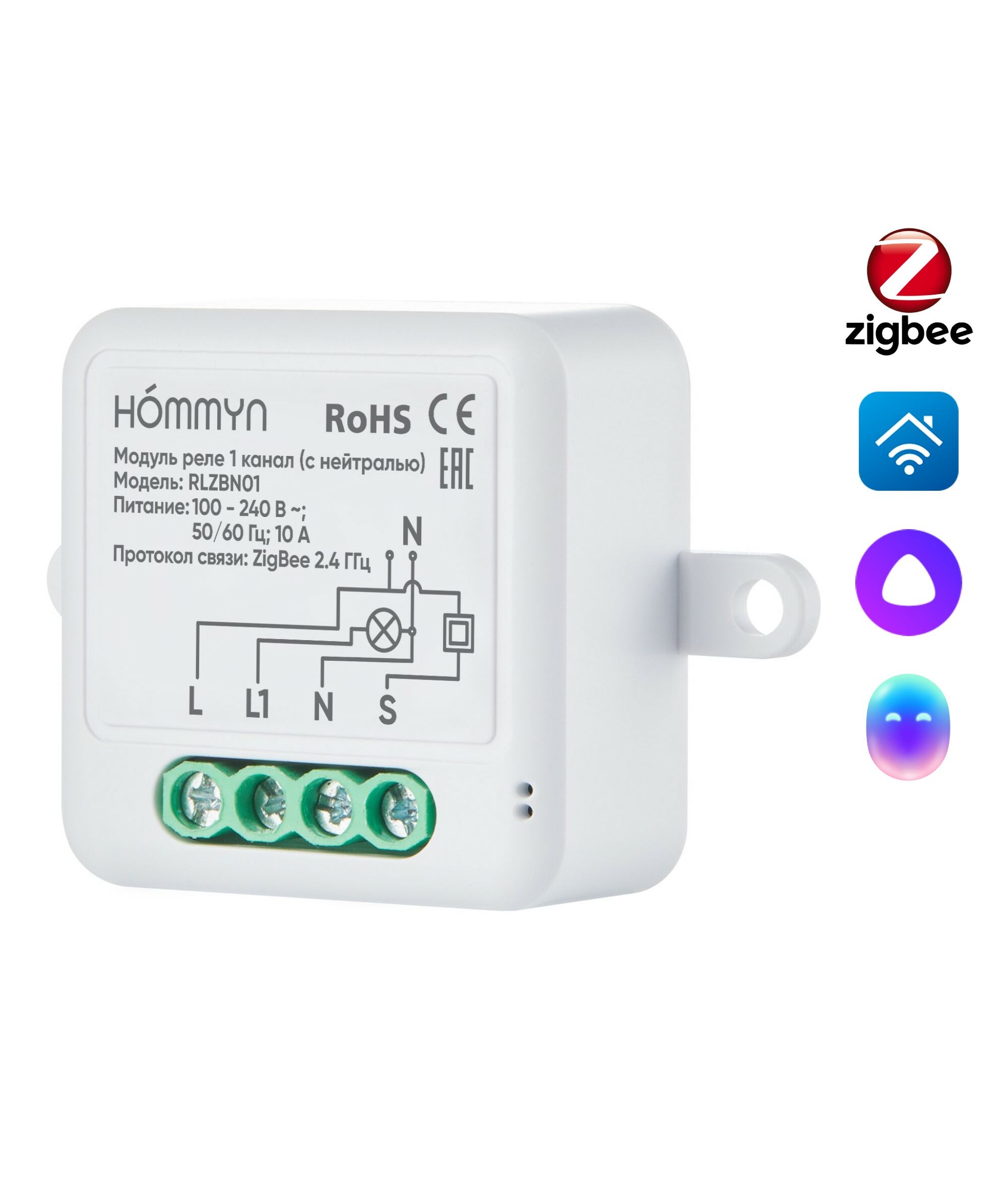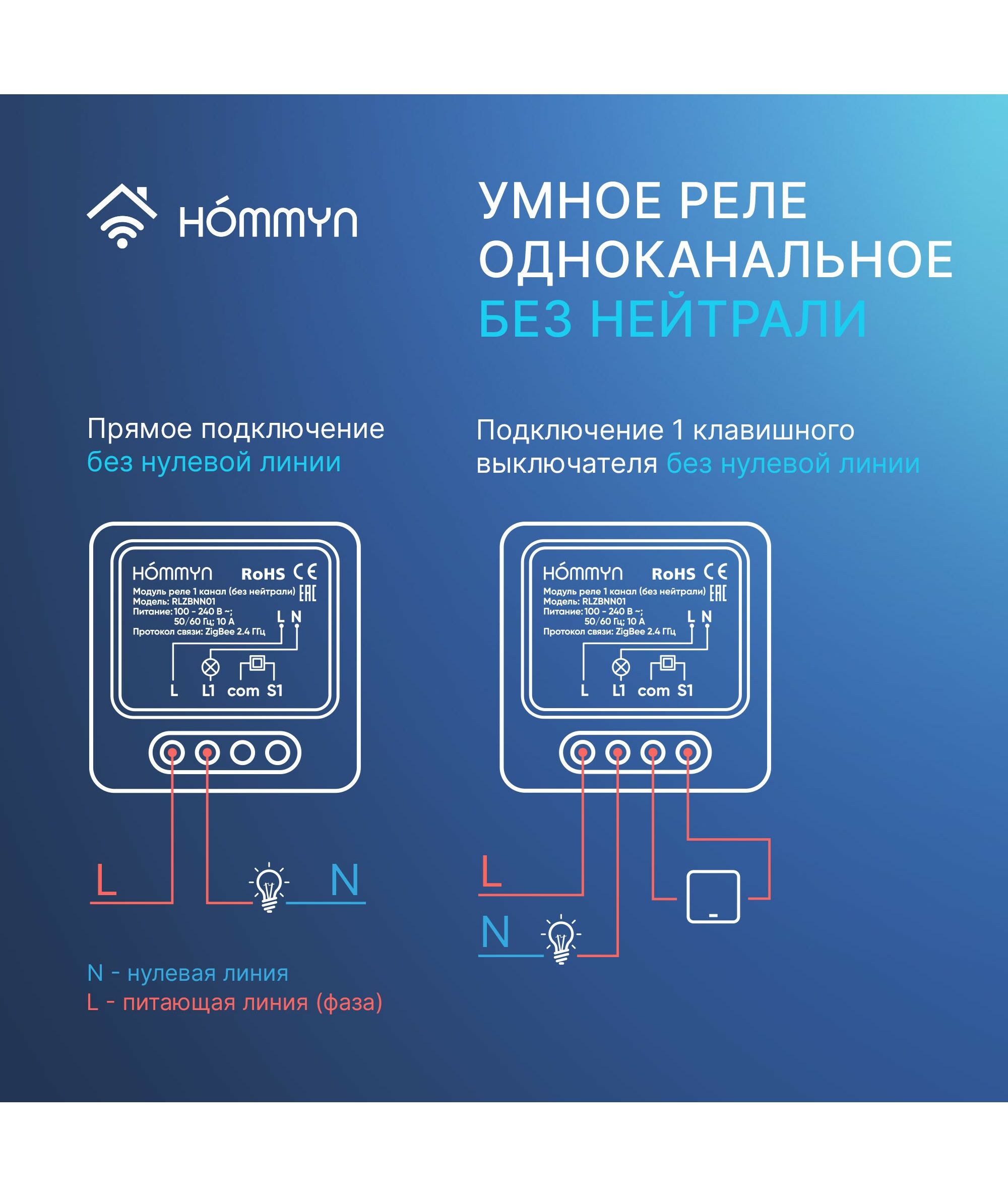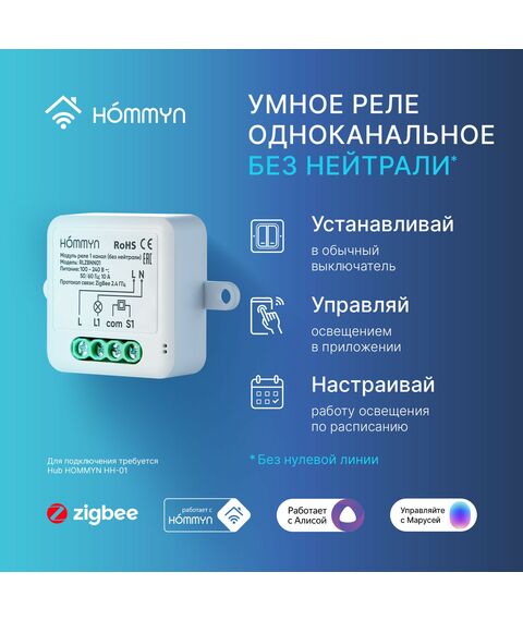Для подключения необходимо только линия L (фаза), нулевая линия N (нейтраль) не требуется. Умное реле обеспечивает управление освещением или подключенными приборами как с помощью старого выключателя, так и через мобильное приложение или голосовых помощников Алиса и Маруся. Реле совместимо с приложением Hommyn и требует наличие Zigbee хаба Hommyn для подключения.