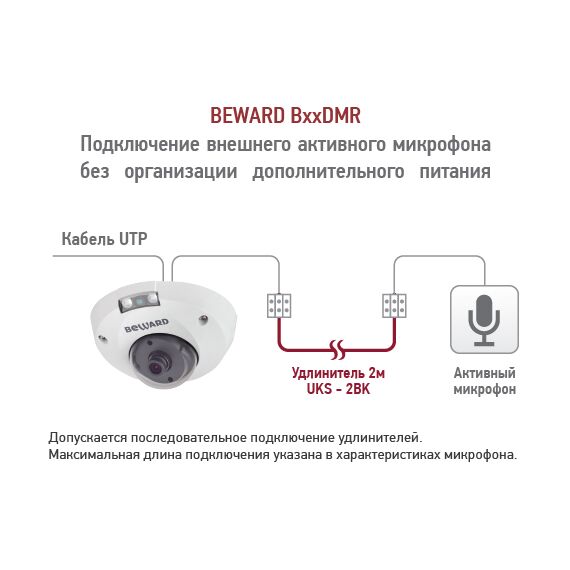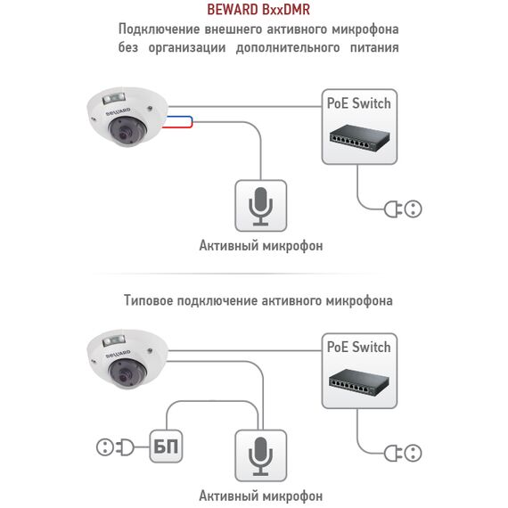 Зачастую оптимальное размещение микрофона отличается от места установки камеры наблюдения. Поэтому для получения более качественного звука и увеличения чувствительности рекомендуется использовать внешний активный микрофон, которому требуется дополнительный блок питания. В модели B2530DMR с поддержкой технологии PoE питание активного микрофона осуществляется напрямую от камеры. Такая организация подключения микрофона экономит издержки и упрощает процесс инсталляции.