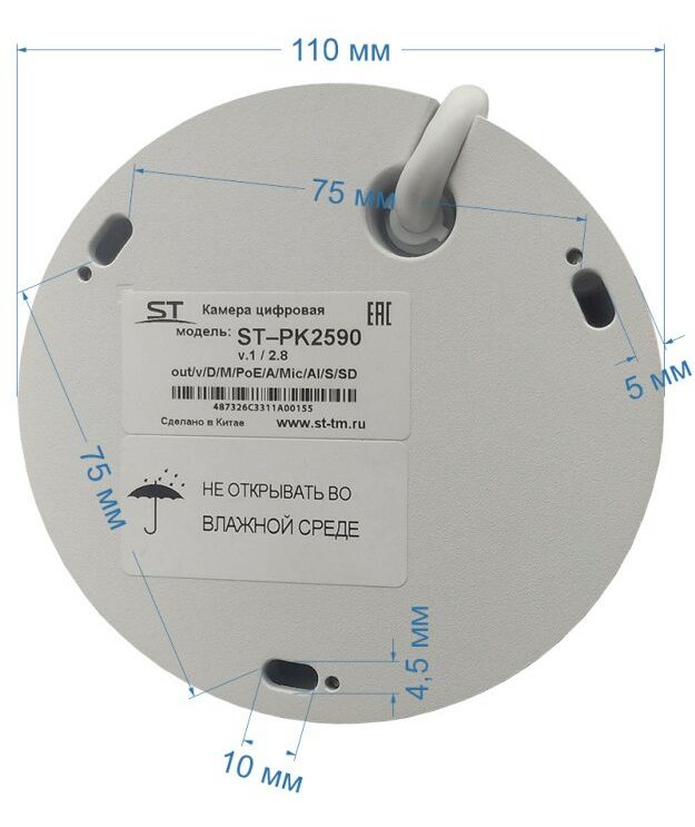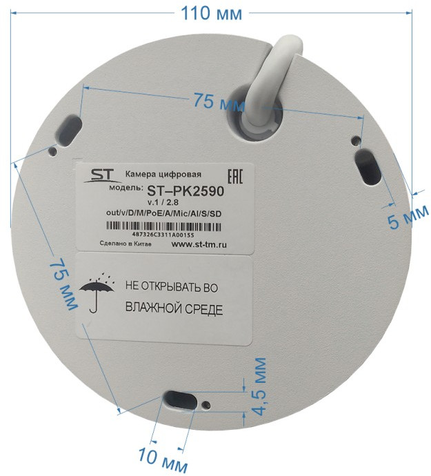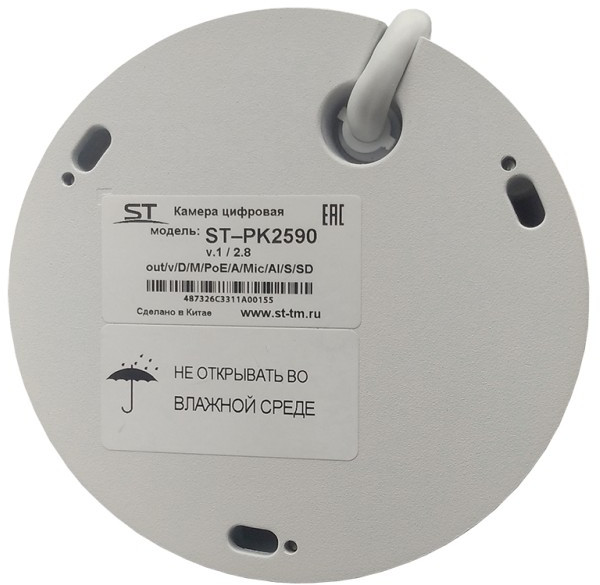 - Комплектность: Камера с кабелем для подключения, крепеж (дюбель-пробка + шуруп), колпачок защитный, ПВХ, для изоляции LAN (RJ-45) разъема от влаги, шаблон бумажный для разметки крепления, cтикер бумажный самоклеящийся предостережение "Ведется видеонаблюдение", паспорт, упаковочная коробка