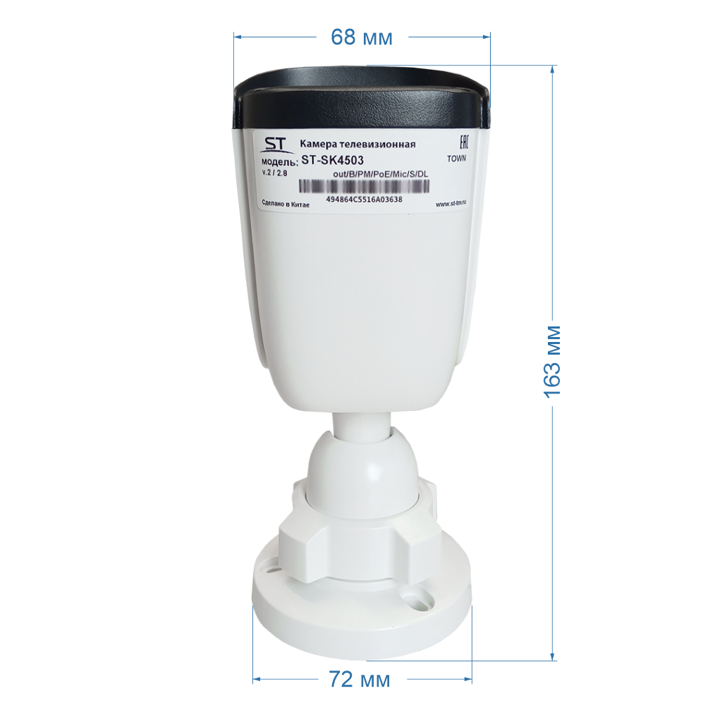 Видеокамера ST ST-SK4503 Dual Light TOWN 4Мп (2,8мм) (версия 2) цилиндрическая, ИК подсветка до 30 м, PoE: 802.3af (вариант А/В), -50…+60°С, IP67, металл, пластик