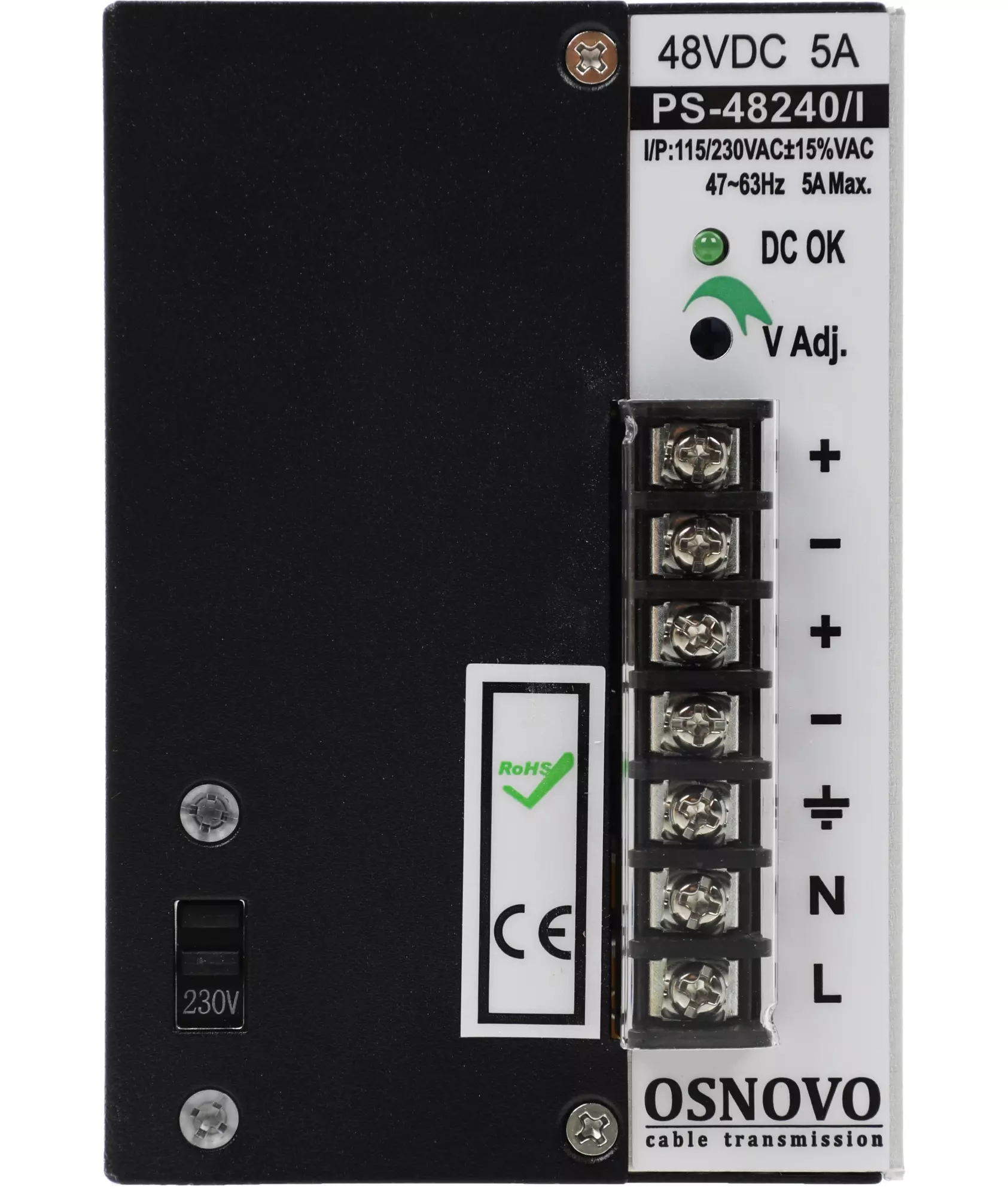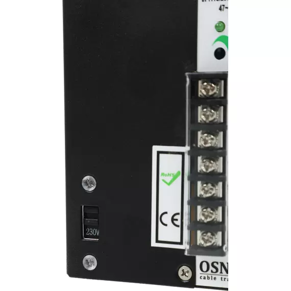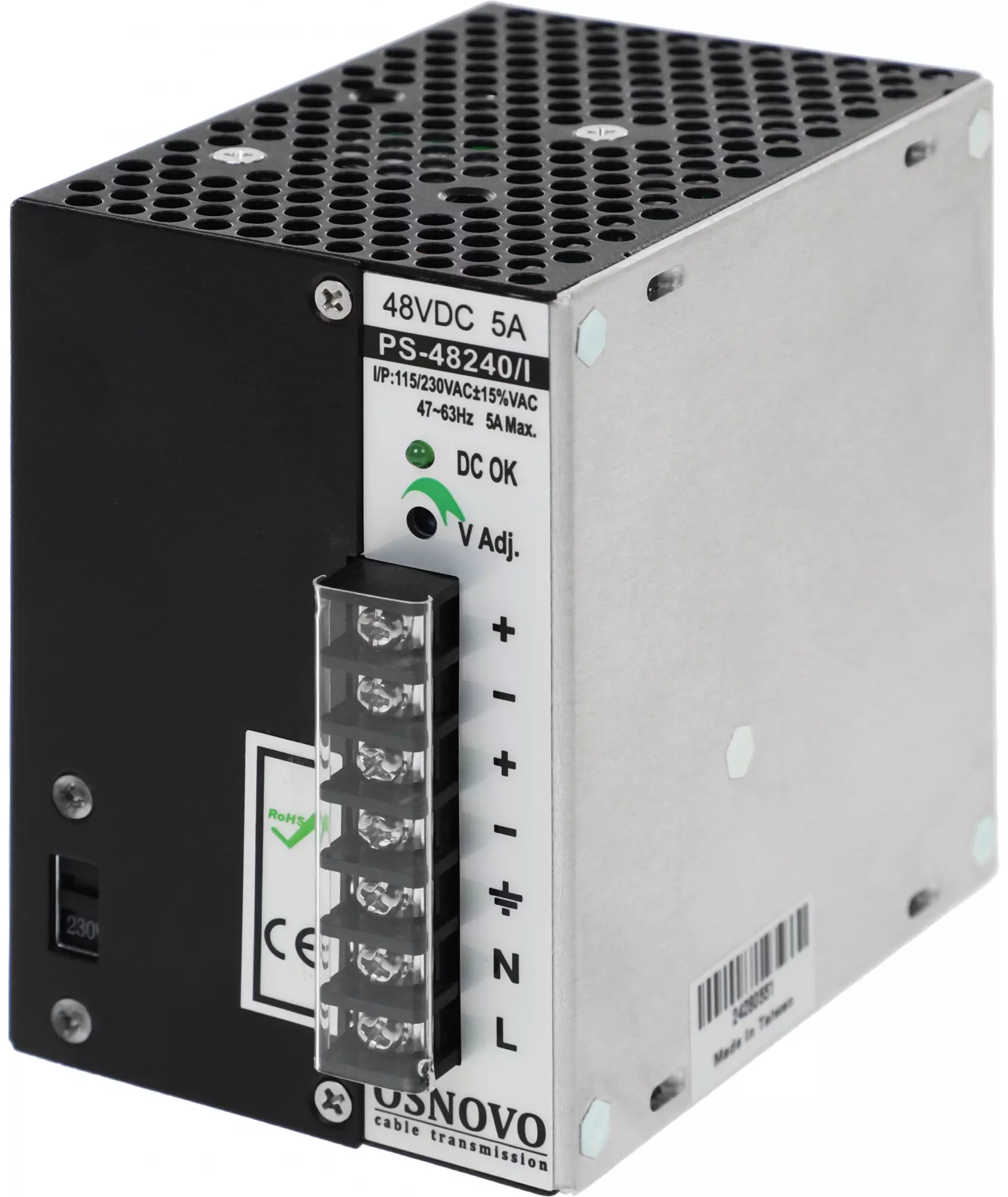 Промышленный блок питания. DC48V, 5A (240W). Входное напряжение AC195-265V. КПД: 84%. Регулировка выходного напряжения в диапазоне 45-53V. Защита от короткого замыкания, перенапряжения и перегрузки. Принудительная система охлаждения (вентилятор). Монтаж на DIN-рейку или стену.