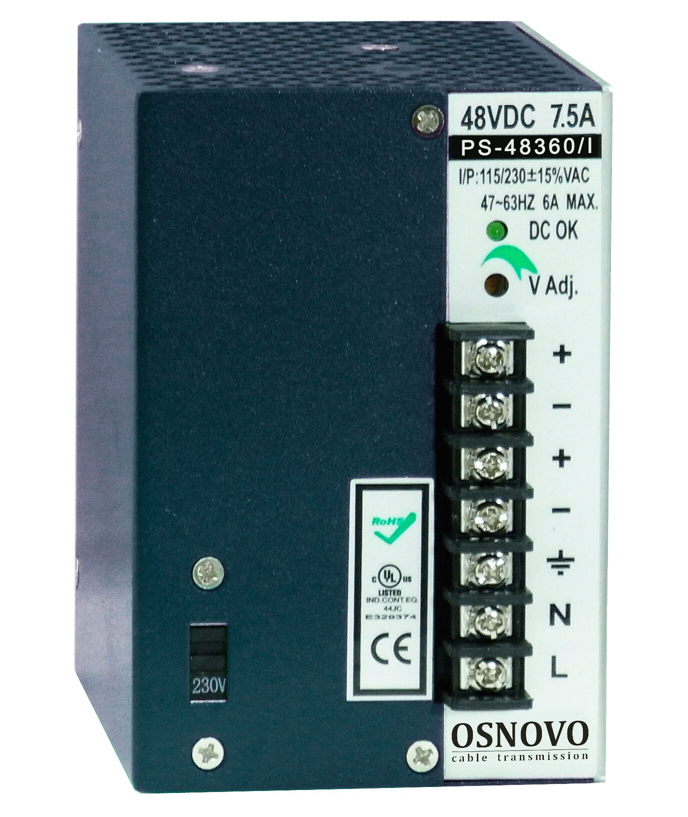 Промышленный блок питания. DC48V, 7,5A (360W). Диапазон входных напряжений: AC195-265V. КПД: 83%. Регулировка выходного напряжения в диапазоне 44-53V. Защита от короткого замыкания, перенапряжения и перегрузки. Принудительная система охлаждения (вентилятор). Монтаж на DIN-рейку или стену.