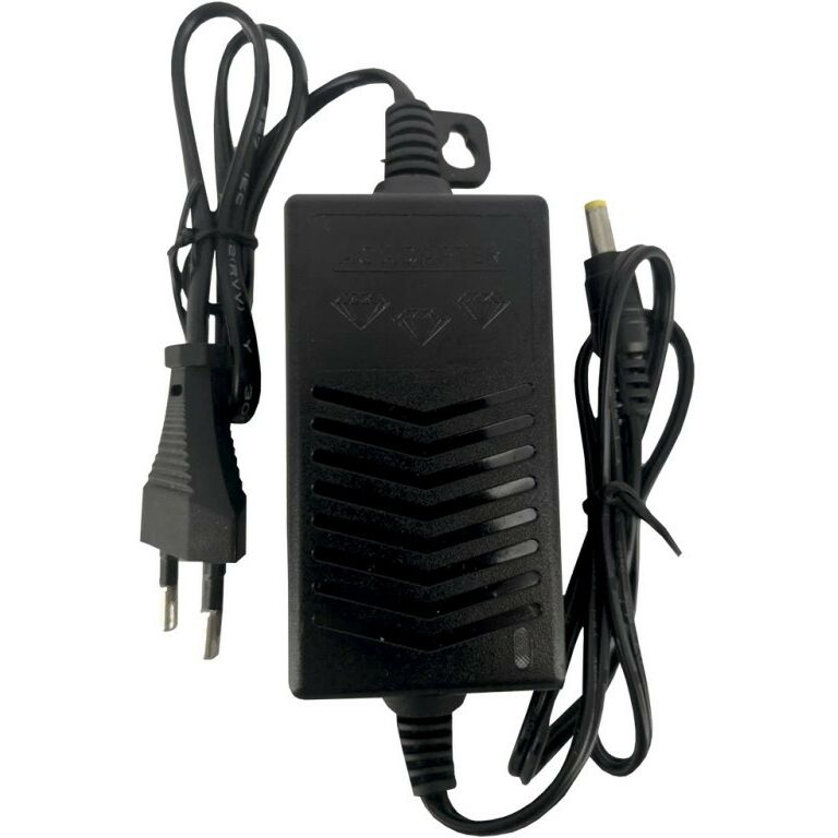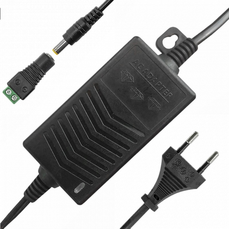 Источник питания с кабелем и вилкой ~220В с одной стороны, и кабелем выходного напряжения 12В с разъемом на конце,разъем для подключения внешней нагрузки к двум винтовым контактам, паспорт, упаковочная коробка.