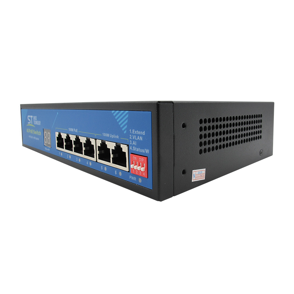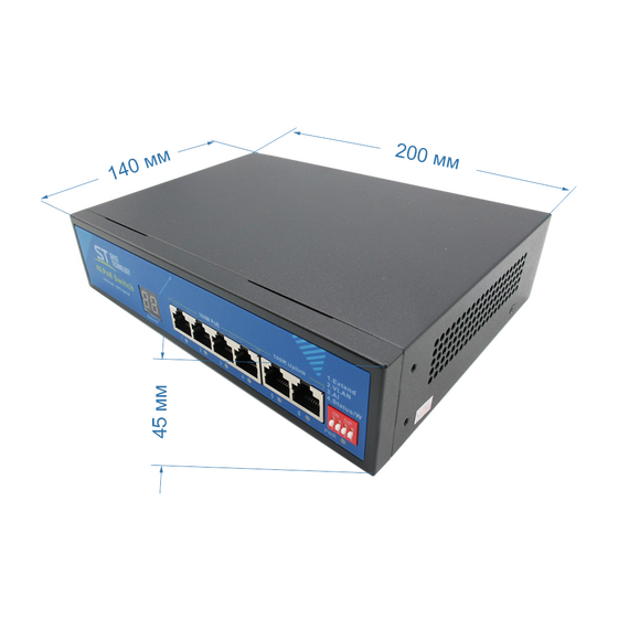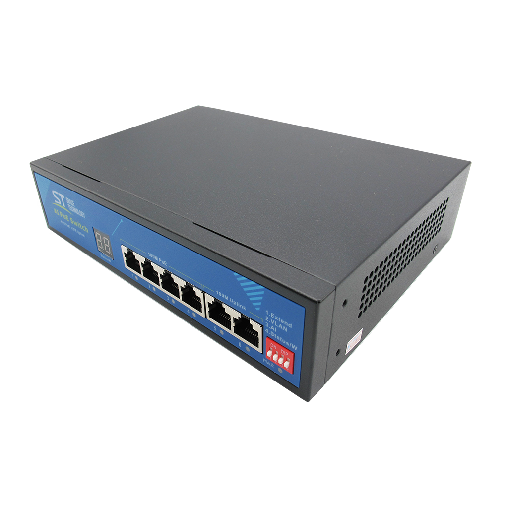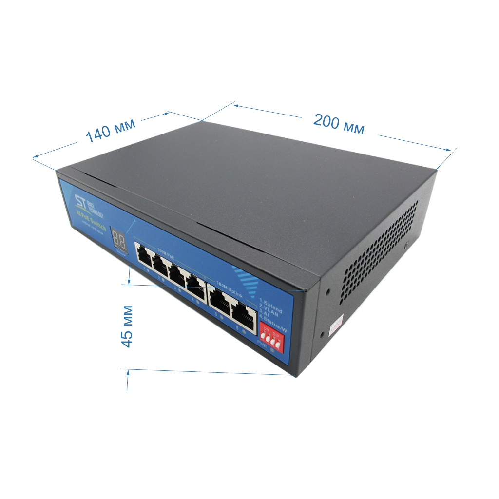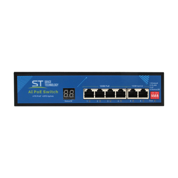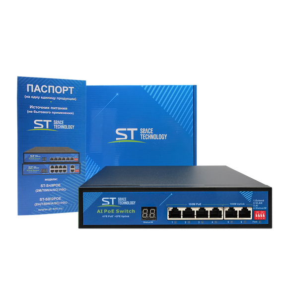 Источник питания ST ST-S49POE (2М/78W/А/SC) PRO Switch POE 4-х портовый, 48В, Защита от КЗ, Extend 250м., AI PoE, AI VLAN, Грозозащита, PoE порты: 4 х (10/100 Мбит/с), UpLink порты: 2 х (10/100 Мбит/с)
