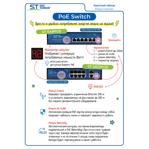 | Дополнительно | AI PoE(watchdog)/Vlan/Extend/Индикатор нагрузки |