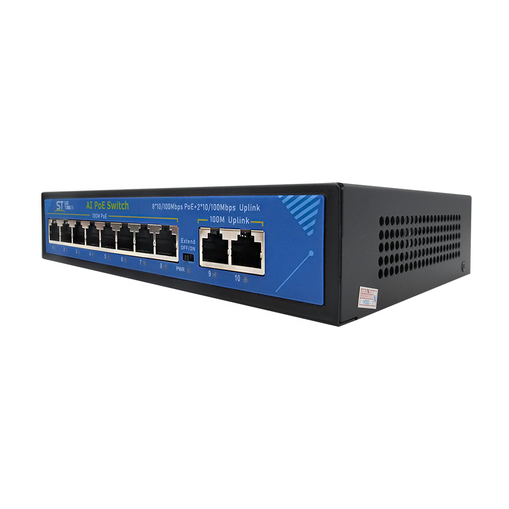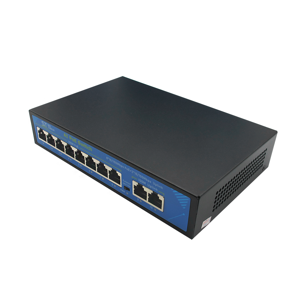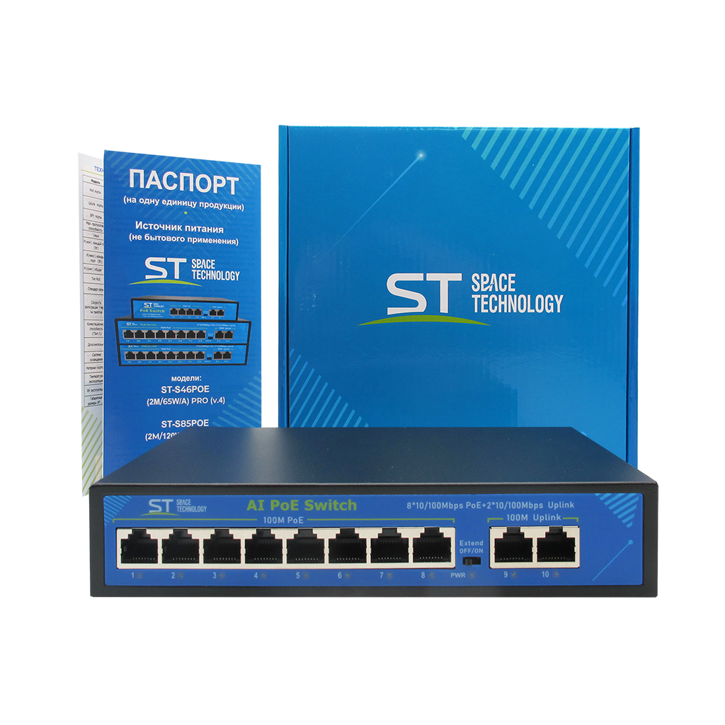 Источник питания ST ST-S85POE (2M/120W/А) PRO (версия 4) Switch POE 8-ми портовый, 48В, защита от КЗ, Extend 250м., AI PoE, AI VLAN, Грозозащита, PoE порты: 8 х (10/100 Мбит/с), UpLink порты: 2 х (10/100 Мбит/с)