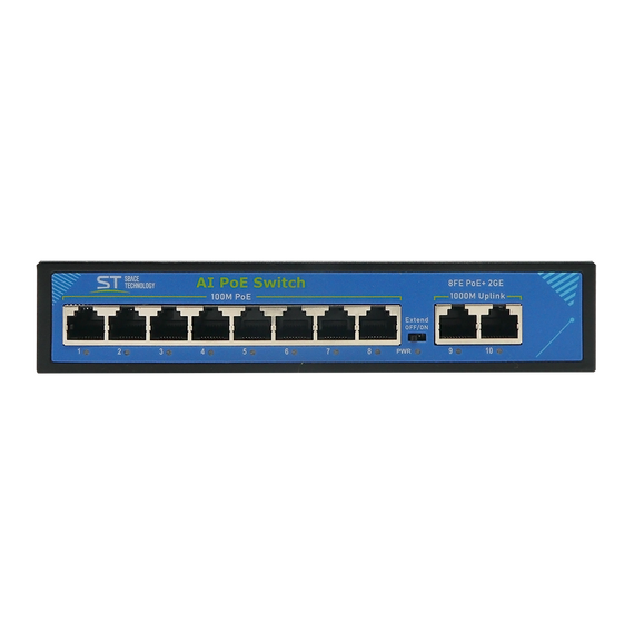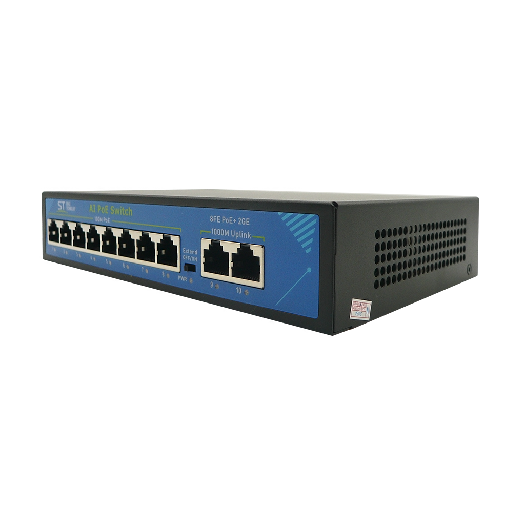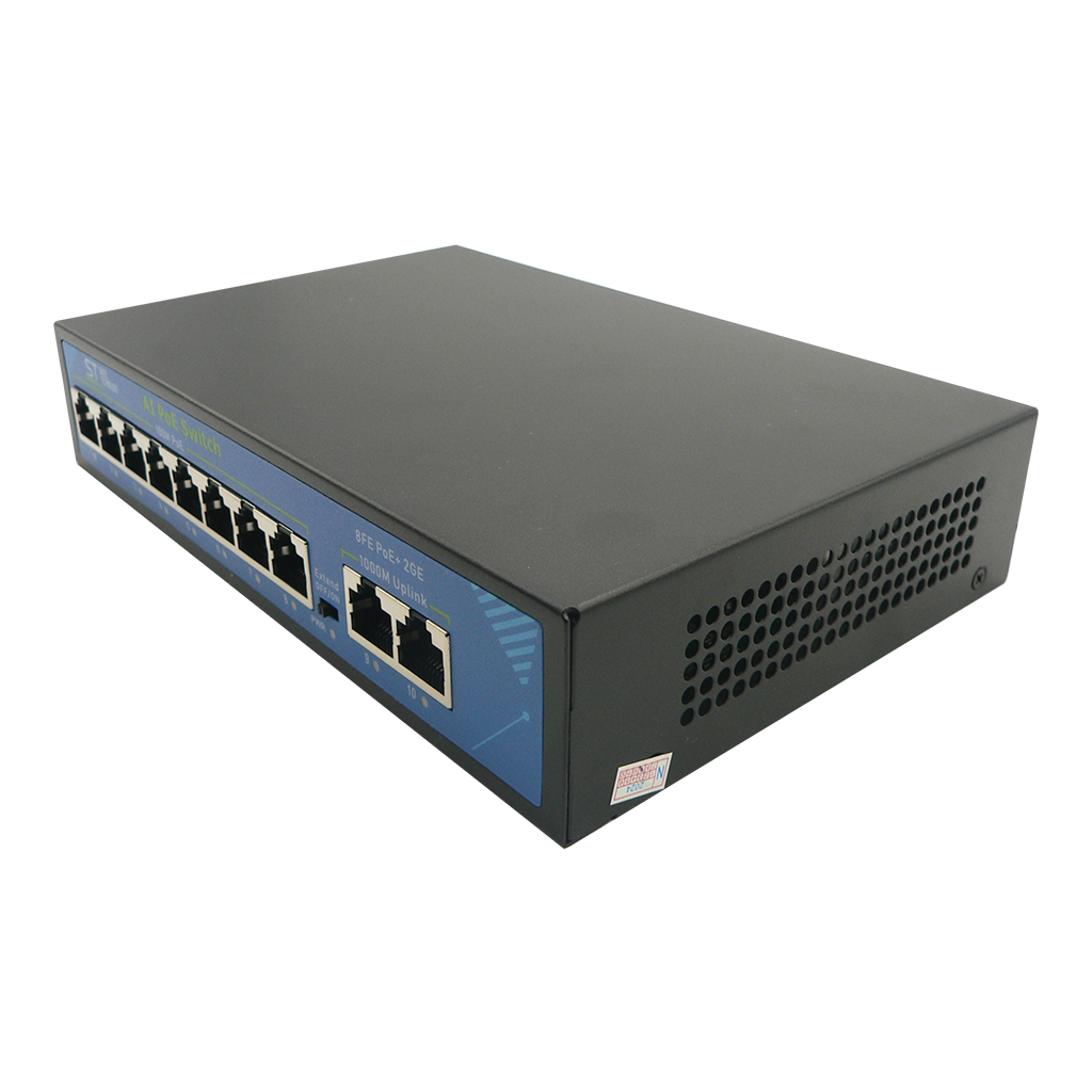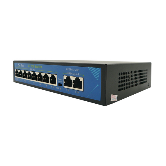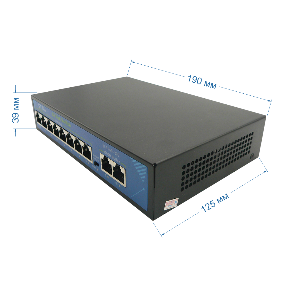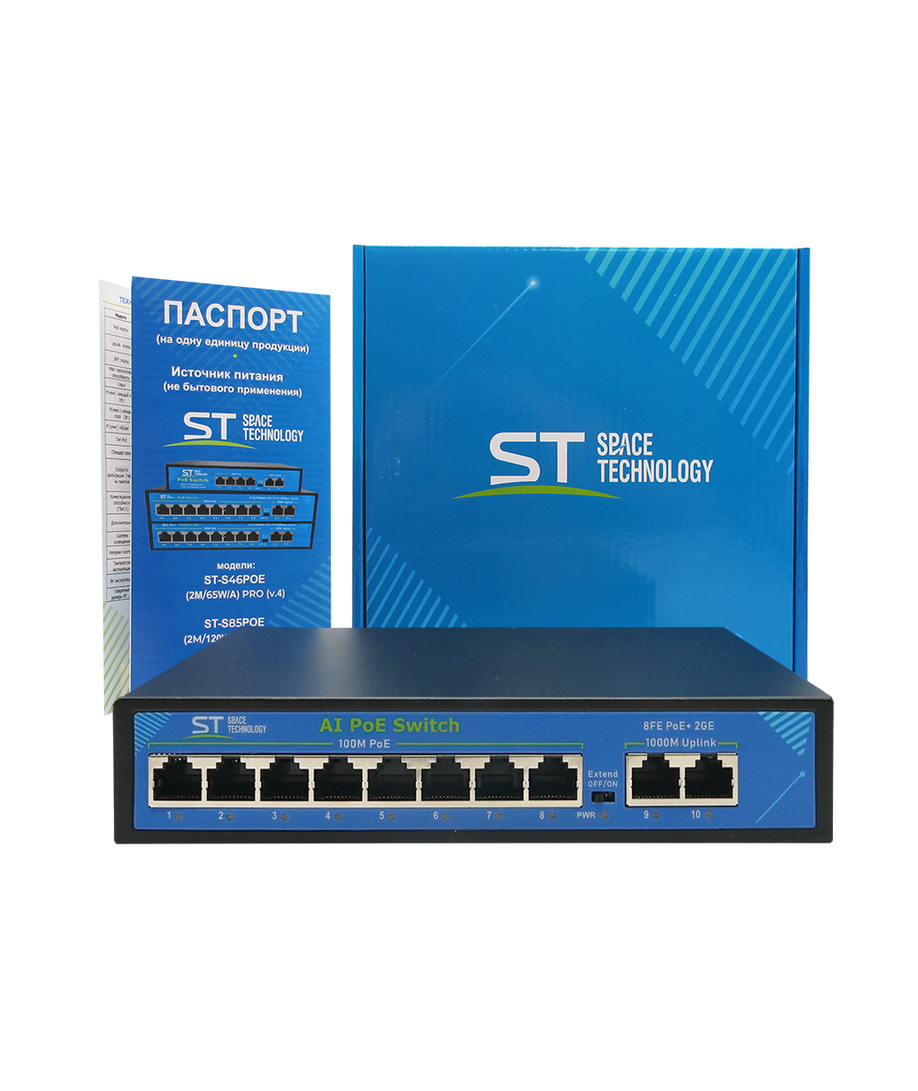 Источник питания ST ST-S86POE (2G/120W/А) PRO (версия 2) POE 8-ми портовый, 48В, защита от КЗ, Extend 250м., AI PoE, AI VLAN, грозозащита, PoE порты: 8 х (10/100 Мбит /с), UpLink порты: 2 х (10/100 /1000 Мбит /с), активное РОЕ металл, -45°C до +55°C