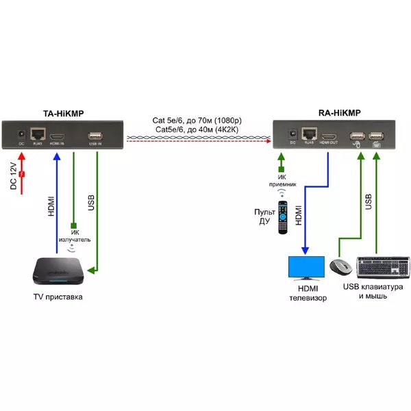 Особенности | Комплект для передачи HDMI, USB, ИК управления и питания по кабелю витой пары (HDBaseT). Расстояние передачи до 40м (4K2K(30Гц)), до 70м (1080p). Поддержка Power over HDBaseT(PoH). Поддержка HDMI 1.4, HDCP 1.2. USB для подключения клавиатуры и мыши. |